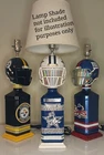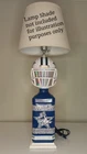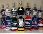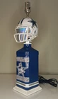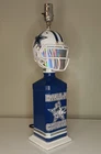 Illuminate your love for the Dallas Cowboys with this unique handcrafted table lamp. Perfect for any fan, this lamp features a helmet design and vibrant multi-color finish. Perfect for any room in your home and is a must-have for any sports enthusiast. Acrylic hand painted die cut Cowboy Joe vinyl decal, Riddell Speed throwback Helmet with handmade sliver visor attached to top felt bottom wooden base 8 ft cord high gloss finish approximately 21 inches in height x 5 inches wide includes LED bulb. Makes a great one of a kind gift !!!! LAMP SHADE NOT INCLUDED. Great Display piece, perfect for fan or man