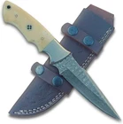 Custom Handmade Damascus Steel Blade Fixed Blade Hunting Knife with Bone Handle and Horizontal Carry Leather Sheath , Heavy Duty Skinner Knife , Bushcraft Knife PREMIUM DAMASCUS STEEL : Hand-forged blade featuring distinctive layered pattern, delivering exceptional sharpness and edge retention with Hardness 56 to 58 HRC . FULL TANG CONSTRUCTION : Damascus Steel Blade Made from 1095 high carbon steel and 15N20 Steels runs through entire handle length for maximum strength and durability during heavy-duty use OVERALL LENGTH: 9 inches or 23 cm total length with ergonomically designed camel bone handle for comfortable grip and precise control . Handle and Blade length is 4.5 inches or 12 cm . Blade thickness is 4mm HORIZONTAL CARRY SHEATH : Durably Stitched Premium vegetable tanned leather sheath included for convenient belt carry and easy access VERSATILE DESIGN : Perfect for hunting, bushcraft, outdoor, camping, and everyday carry tasks with its robust fixed blade design