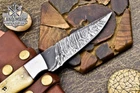 Custom Hand Made DAMASCUS STEEL HUNTING KNIFE WITH BONE HANDLE We offer a shipping discount for More then one purchased . And discount will be apply on combine invoice, Discount will not apply on separate payment. ITEM DETAILS OVER ALL LENGTH 8.0 inches long (Approx) HANDLE LENGTH 4.0 inches long (Approx) BLADE LENGTH 4.0 inches long (Approx) BLADE HARDNESS 58-60 HRC Which Holds The Sharp Edge For Long Time. HANDLE BONE COVER LEATHER SHEATH This Awesome custom made KNIFE has a nice hand forged with the combination of 4340 & 1080 steel. HOW OUR DAMASCUS IS MADE: All our Damascus is real and not just an acid etch. Damascus is a mixture of 1080HC and 4340 nickel carbon. You heat them up together and then fold the bar over and over to get the desired layers, ours are 396 layers. Then you burn the blade in acid, and it turns the nickel satin color and the high carbon turns blackish gray. This is how the layers are exposed to show the layers of the new steel created coined "Damascus". All Damascus is acid etched to show the layers. If you high polish the metal it will be shinny satin like all steels. Only after you burn the sides of the blade with acid do you see the layers of the two steels. Makes sense? After we make our knives we high polish the handles and put an edge on the blade. The high polishing buffs off the acid burned layer of the handle, and the blade edge is sharpened and the acid burned edge becomes satin. You can re-burn the tang of the blade near the handles and the edge of the blade and it will show the layers once more. All our knives are hand made, durable and unique ***** YOU WILL RECEIVED THE SAME KNIFE Qality Standards Our Damascus blades are made from high quality non-stainless steels which rival or exceed any Damascus blade made from the 10 series with 4340. Our Damascus combination has taken years to perfect and has been tested under a variety of application which will offer professional performance in categories of toughness, strength (lateral stress) and edge honing and holding ability. In a 5 spot Rockwell test our blades will average near or close to 58 which offers a perfect balances between its toughness and strength.Our blades due to carbon content need to be regularly treated with wax and/or 3 in 1 oil to maintain its superior quality. Questions if you have any question feel free to send us message we aim to answer all questions within 24 hours Feedback If you are not satisfied with our service please contact us before leaving any negative or natural feedback. We will resolve all issues as quickly as possible. Disclaimer We are not responsible for any injuries associated with the use of our tools. Our products are intended for legal use only by responsible buyers. Therefore, we will not sell our products to anyone under the age of 18. Before bidding please check your country laws as some countries Custom don't allow this. If your purchase is held by Custom Authorities in your country/State we will not be responsible for that and no refund will be issued Shipping We offer a 20% shipping discount for More then one purchased . And discount will be apply on combine invoice, Discount will not apply on separate payment We ship within 24 hours after receiving complete payment but this can be delayed due to week ends or Governments and Religious Festivals . . This is beyond our control and we apologize for this inconvenience. Precautions Our Tools are very sharp so open and use them very carefully We are not responsible for any injuries associated with the use of our tools Tips to Care knife 1. NEVER STORE YOUR KNIFE FOR LONG TIME IN LEATHER SHEATH. 2. LEATHER CAN ABSORB WATER, WHICH WILL RUST THE KNIFE. 3. ALWAYS CLEAN THE BLADE AFTER USING WITH OIL OR WAX