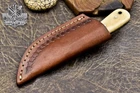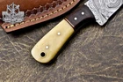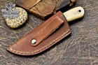 Custom Hand Made DAMASCUS STEEL HUNTING KNIFE WITH CAMEL BONE HANDLE We offer a shipping discount for More then one purchased . And discount will be apply on combine invoice, Discount will not apply on separate payment. ITEM DETAILS OVER ALL LENGTH 3.0 inches long (Approx) HANDLE LENGTH 1.5 inches long (Approx) BLADE LENGTH 1.5 inches long (Approx) BLADE HARDNESS 58-60 HRC Which Holds The Sharp Edge For Long Time. HANDLE CAMEL BONE COVER LEATHER SHEATH This Awesome custom made KNIFE has a nice hand forged with the combination of 4340 & 1080 steel. HOW OUR DAMASCUS IS MADE: All our Damascus is real and not just an acid etch. Damascus is a mixture of 1080HC and 4340 nickel carbon. You heat them up together and then fold the bar over and over to get the desired layers, ours are 396 layers. Then you burn the blade in acid, and it turns the nickel satin color and the high carbon turns blackish gray. This is how the layers are exposed to show the layers of the new steel created coined "Damascus". All Damascus is acid etched to show the layers. If you high polish the metal it will be shinny satin like all steels. Only after you burn the sides of the blade with acid do you see the layers of the two steels. Makes sense? After we make our knives we high polish the handles and put an edge on the blade. The high polishing buffs off the acid burned layer of the handle, and the blade edge is sharpened and the acid burned edge becomes satin. You can re-burn the tang of the blade near the handles and the edge of the blade and it will show the layers once more. All our knives are hand made, durable and unique ***** YOU WILL RECEIVED THE SAME KNIFE Qality Standards Our Damascus blades are made from high quality non-stainless steels which rival or exceed any Damascus blade made from the 10 series with 4340. Our Damascus combination has taken years to perfect and has been tested under a variety of application which will offer professional performance in categories of toughness, strength (lateral stress) and edge honing and holding ability. In a 5 spot Rockwell test our blades will average near or close to 58 which offers a perfect balances between its toughness and strength.Our blades due to carbon content need to be regularly treated with wax and/or 3 in 1 oil to maintain its superior quality. Questions if you have any question feel free to send us message we aim to answer all questions within 24 hours Feedback If you are not satisfied with our service please contact us before leaving any negative or natural feedback. We will resolve all issues as quickly as possible. Disclaimer We are not responsible for any injuries associated with the use of our tools. Our products are intended for legal use only by responsible buyers. Therefore, we will not sell our products to anyone under the age of 18. Before bidding please check your country laws as some countries Custom don't allow this. If your purchase is held by Custom Authorities in your country/State we will not be responsible for that and no refund will be issued Shipping We offer a 20% shipping discount for More then one purchased . And discount will be apply on combine invoice, Discount will not apply on separate payment We ship within 24 hours after receiving complete payment but this can be delayed due to week ends or Governments and Religious Festivals . . This is beyond our control and we apologize for this inconvenience. Precautions Our Tools are very sharp so open and use them very carefully We are not responsible for any injuries associated with the use of our tools Tips to Care knife 1. NEVER STORE YOUR KNIFE FOR LONG TIME IN LEATHER SHEATH. 2. LEATHER CAN ABSORB WATER, WHICH WILL RUST THE KNIFE. 3. ALWAYS CLEAN THE BLADE AFTER USING WITH OIL OR WAX