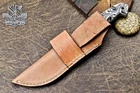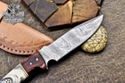 This knife is absolutely stunning! The Damascus steel blade is razor-sharp and holds its edge perfectly, while the white swirl resin handle adds a touch of elegance. The craftsmanship is top-notch—you can tell it’s hand-forged with care. It feels balanced and sturdy in hand, making it great for hunting or outdoor use. The leather sheath is a nice protective touch. Plus, the seller offers shipping discounts for multiple purchases. A must-have for any knife enthusiast!