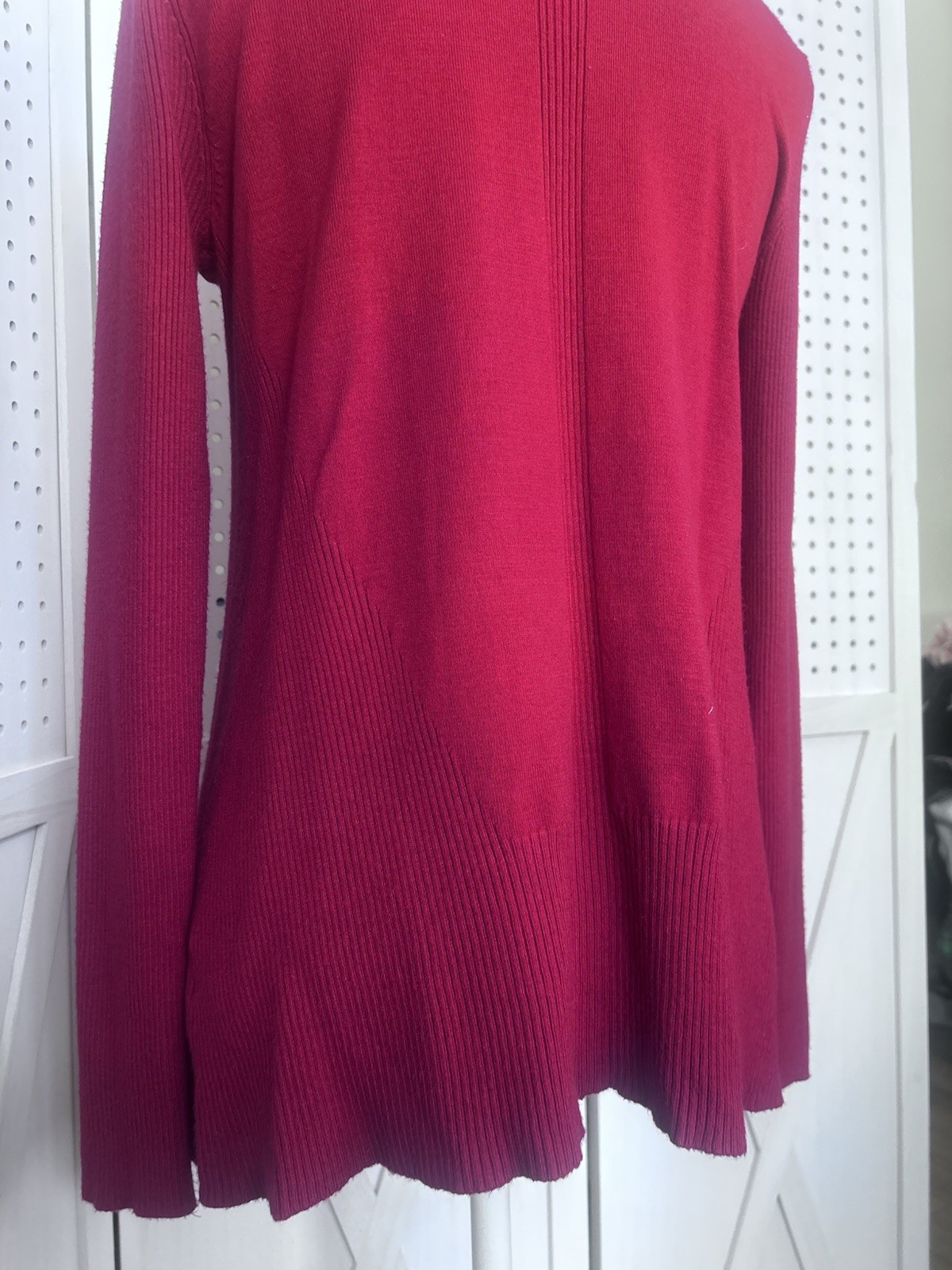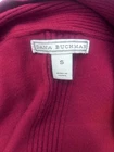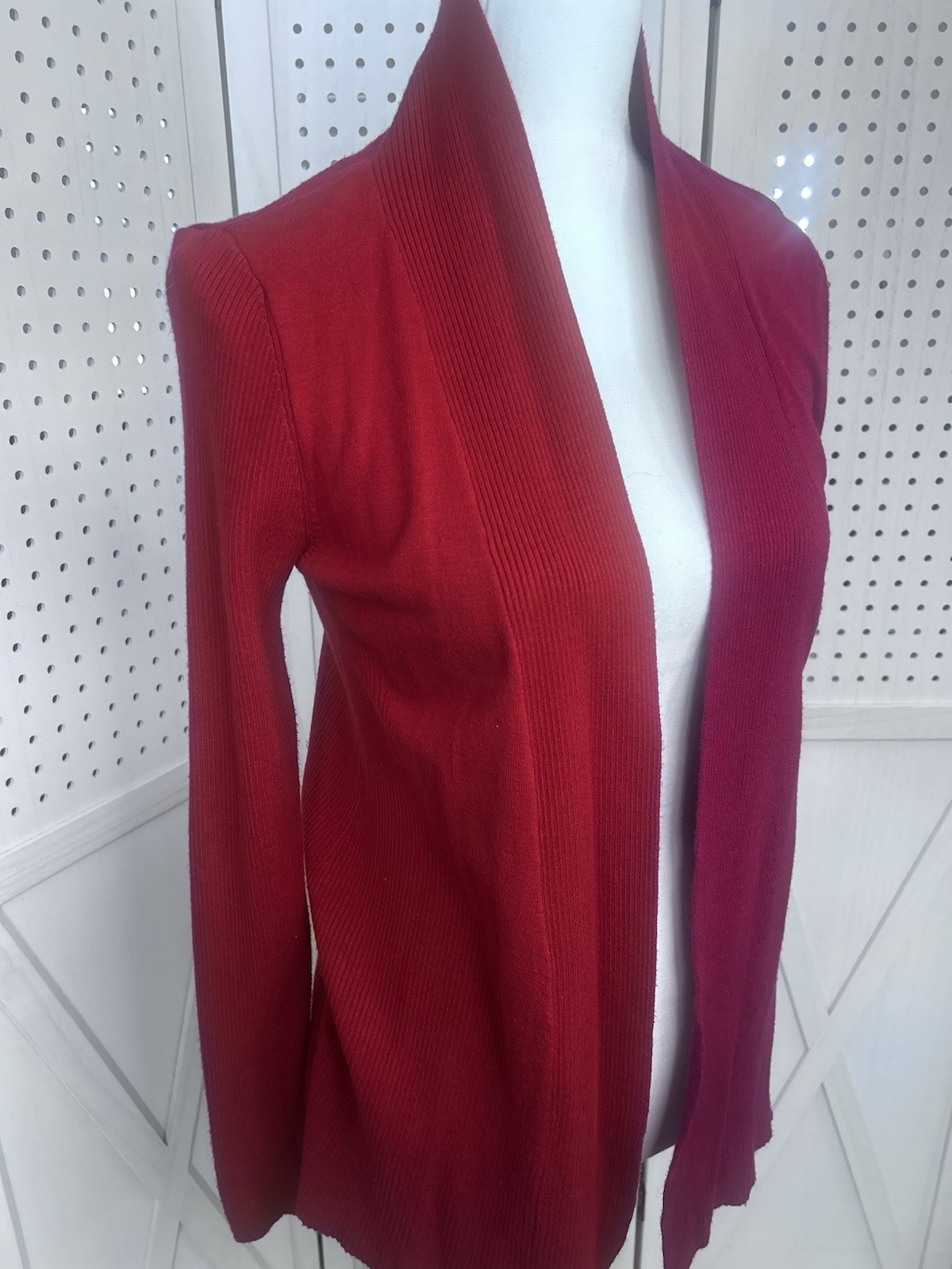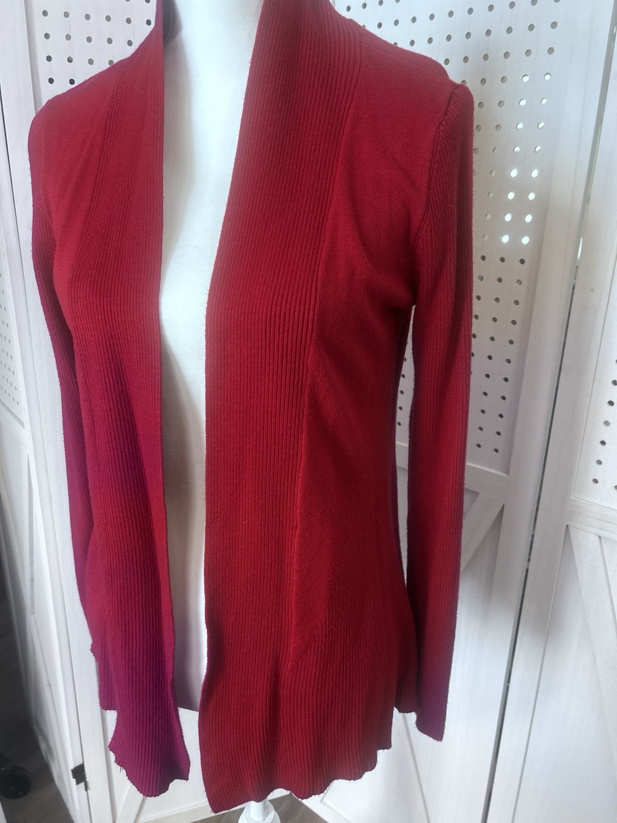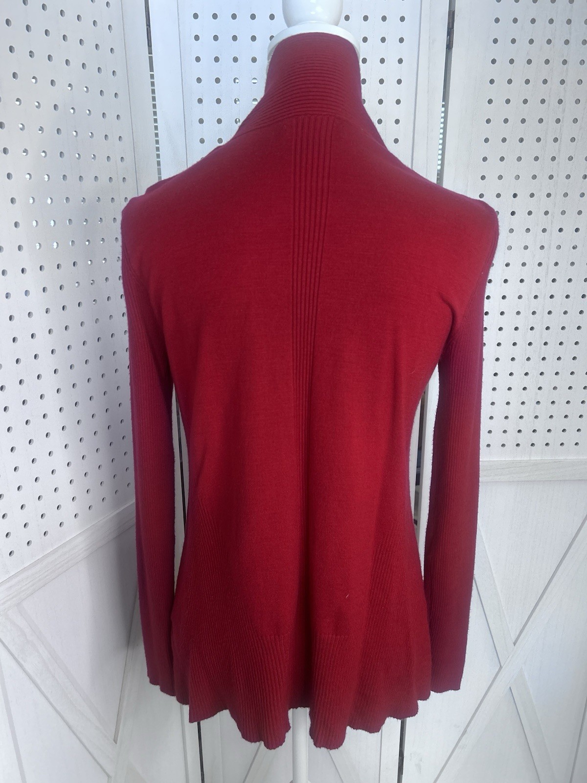 This Dana Buchman Ribbed Open Front Shawl Cardigan Sweater in red, size small, is a versatile and stylish addition to any woman's wardrobe. Made from a knit fabric with a tight-knit design, it features ribbed accents and a long sleeve length, making it perfect for various occasions such as casual outings, workwear, or even a party or travel. The sweater is machine washable and offers a regular fit, with a solid pattern and a classic theme.