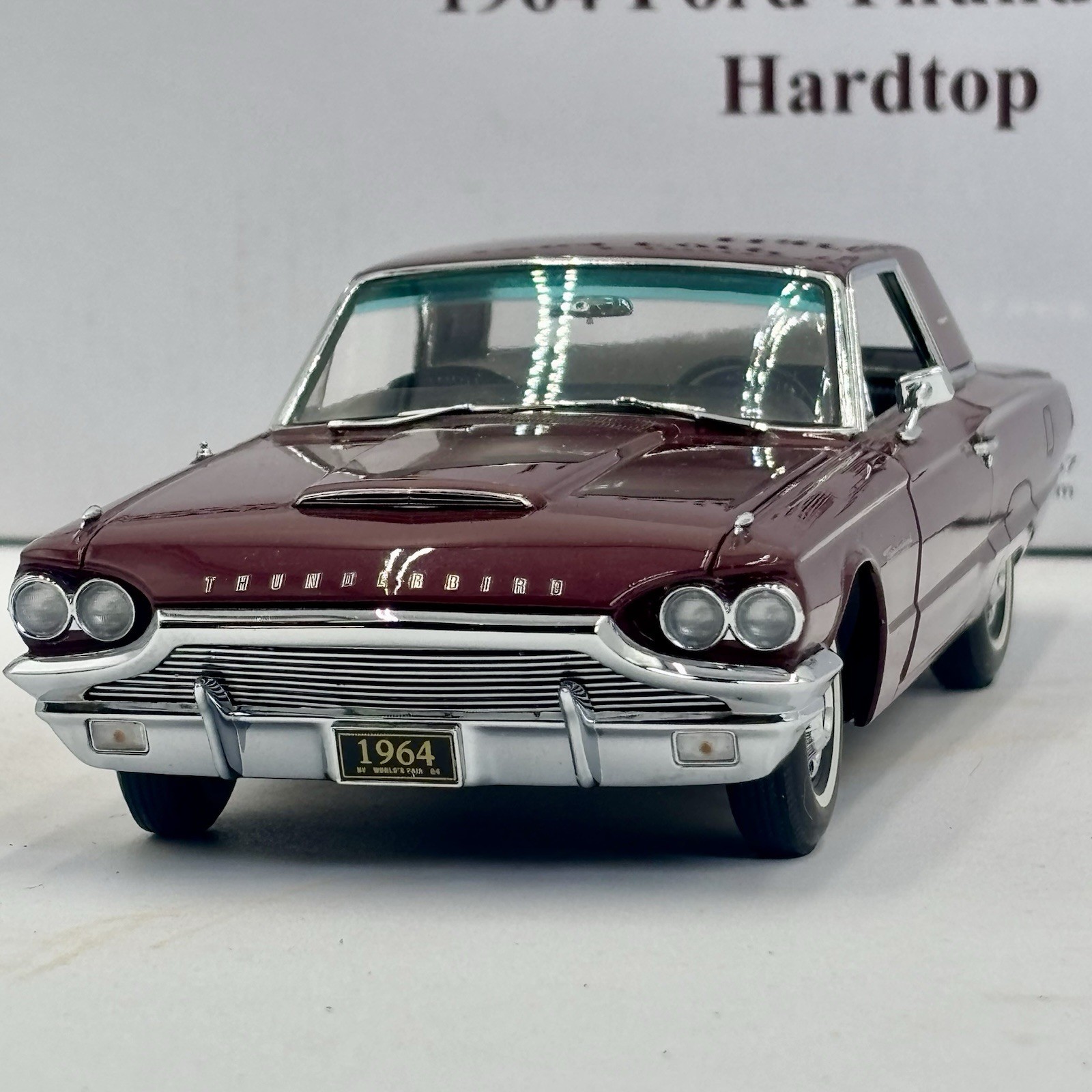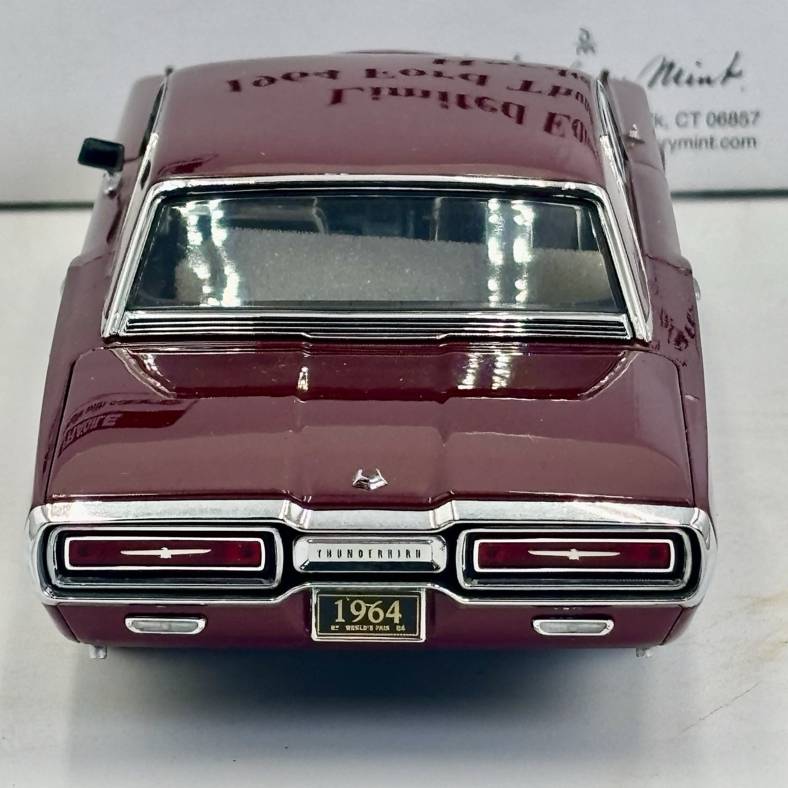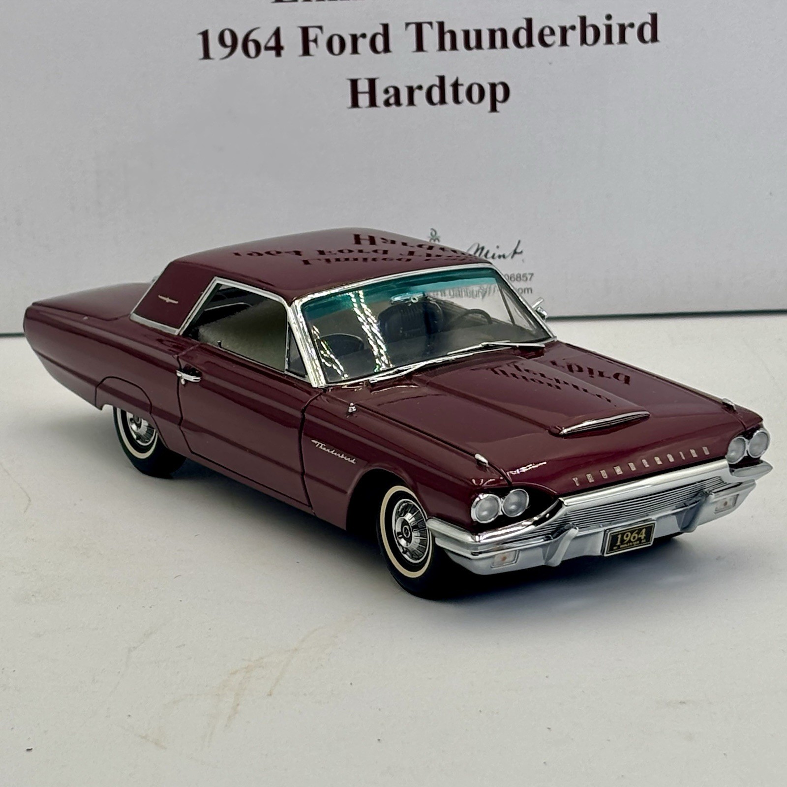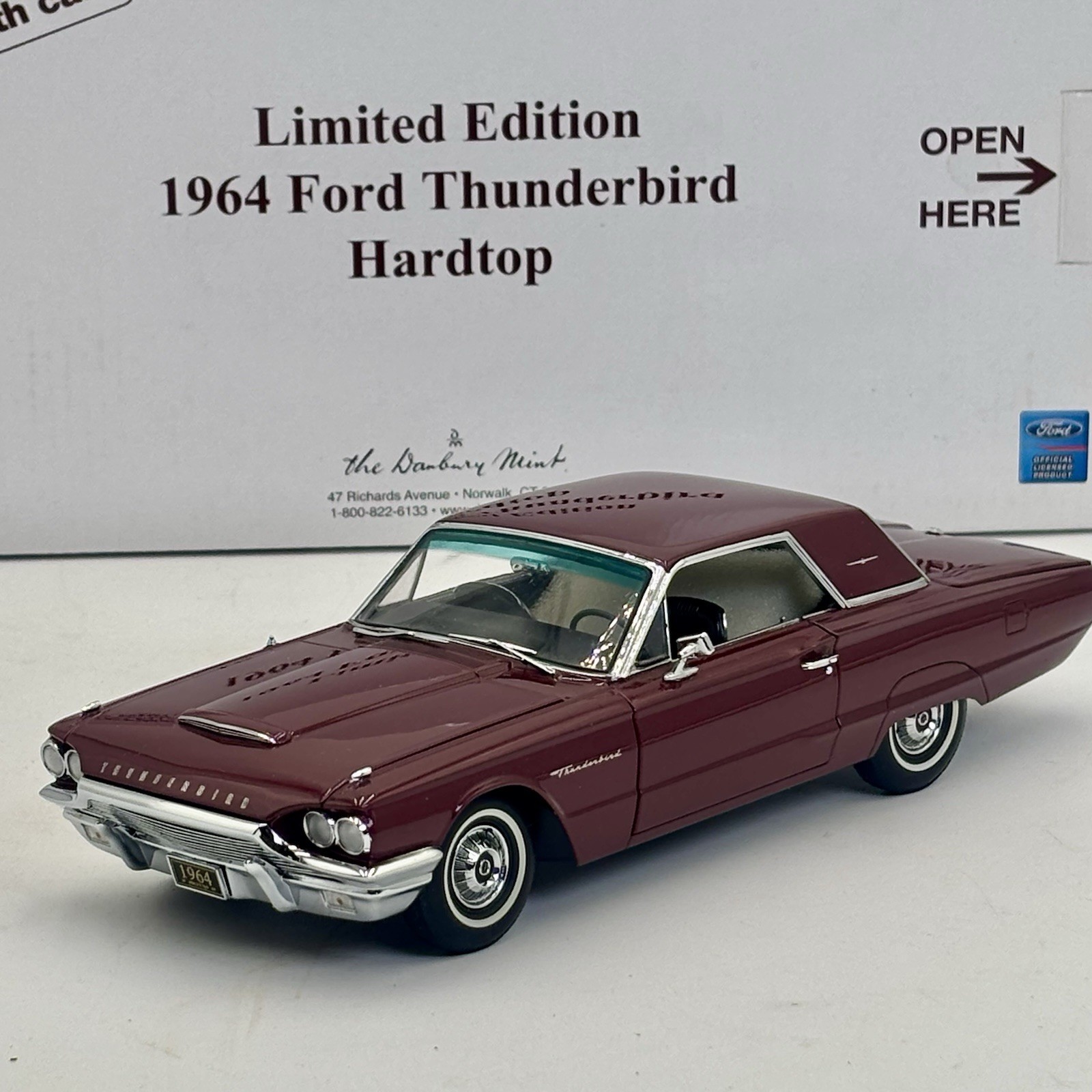 The Danbury Mint Limited Edition 1964 Ford Thunderbird Burgundy Hardtop Box is a highly collectible diecast toy vehicle. This detailed 1:24 scale model features the classic Ford Thunderbird design from 1964, with a vibrant red color scheme that adds to its appeal. The limited edition status further enhances its value and desirability among collectors of contemporary diecast cars. Perfect for enthusiasts of Ford vehicles or vintage cars in general, this model is a must-have for any diecast car collection.