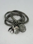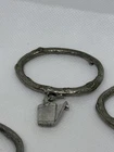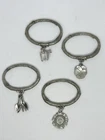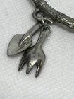 This is a set of four Danforth Pewter napkin rings featuring a gardening floral theme charm. The napkin rings are made of silver pewter and have a unique design. Perfect for adding a touch of elegance to your dining table, these napkin rings would make a charming addition to any kitchen or dining room decor.