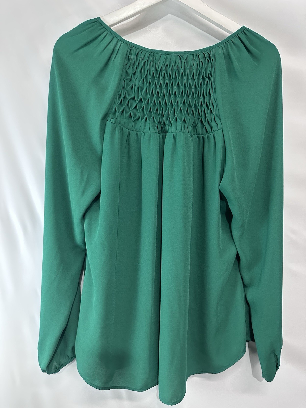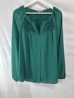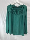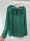 MEASUREMENTS length-28/29” bust-23.5” The product is a women's chiffon blouse in a solid green color with long flared sleeves and a V-neckline. It is from the brand Daniel Rainn and is designed with a regular fit. Made of lightweight polyester chiffon fabric, this blouse is suitable for all seasons and features a classic and colorful style. It is perfect for adding a touch of elegance to any outfit.
