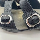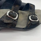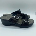 Dansko Women's size 9.5 / 40 Black Animal Print Strappy Buckle Heel Sandals. Dansko brand women's sandals in a size 9.5US or 40EU. Black strappy sandals with adjustable silver buckles. Animal pattern design, one shoe is all black, the other has some gold in the pattern. In great pre-owned condition, see photos for more details.
