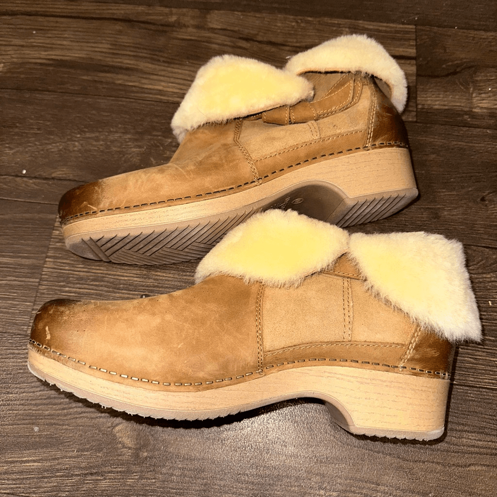 Dansko ortho, comfortable, Sherpa lined, distressed, tan, slip on, European clogs. In good, gently used condition. From a pet and smoke free house.