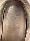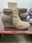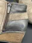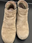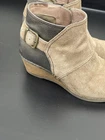 Dansko Shirley Ankle Boots for women in size 37, featuring a round toe, zip closure, brown suede upper, and comfortable wedge heel. These booties are designed for travel, casual, and business occasions, with arch support and orthopedic features. The biker-inspired style with buckle detail makes them suitable for going out or everyday wear during the winter, summer, fall, and spring seasons. See last two pics for touch up of rubbed inside spots !