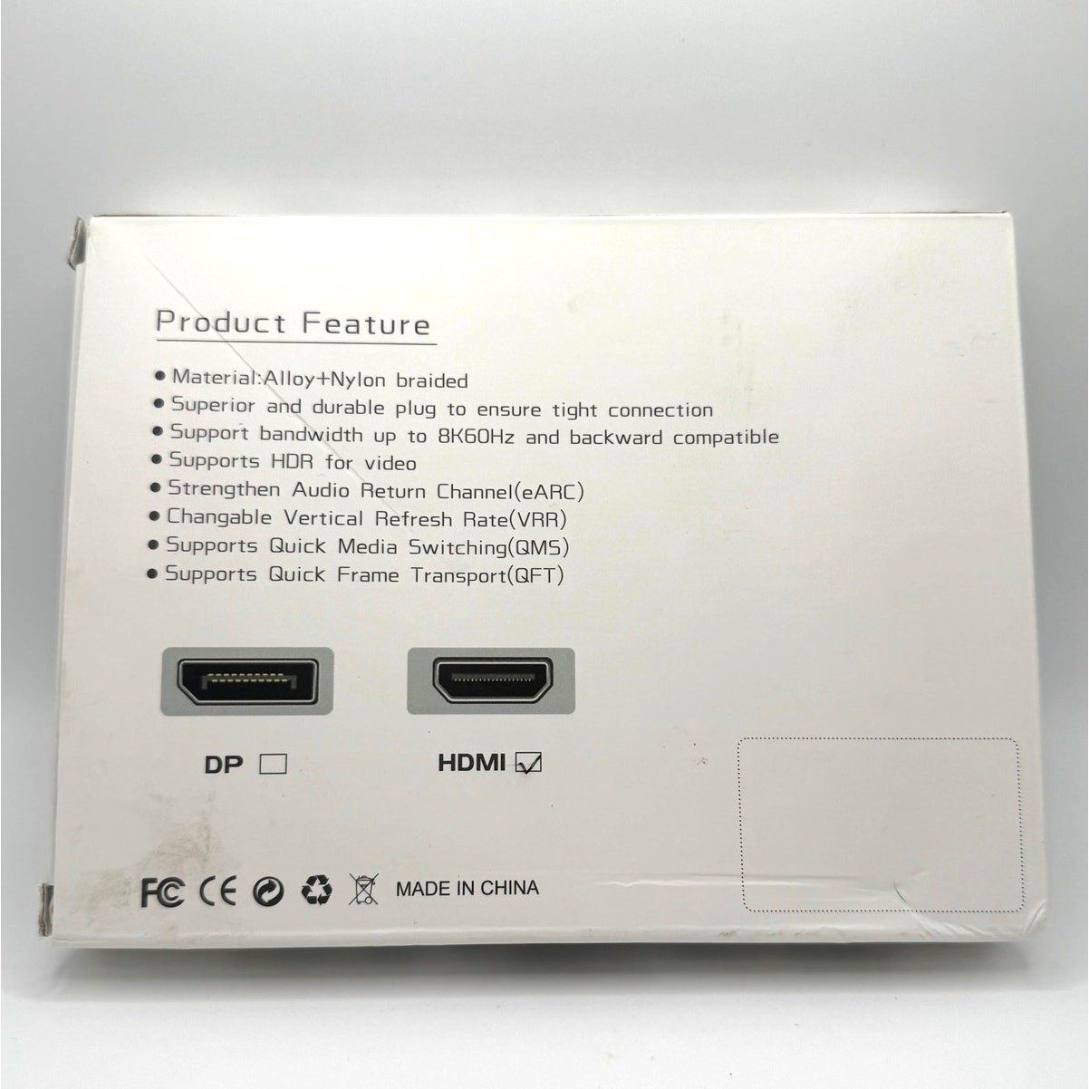 Daofaziran 8K Ultra HD HDMI/DP Cable Made in China Description: Product Feature: Material: Alloy+Nylon braided Superior and durable plug to ensure tight connection Support bandwidth up to 8K60Hz and backward compatible Supports HDR for video Strengthen Audio Return Channel(ARC) Changable Vertical Refresh Rate(VRR) Supports Quick Media Switching(QMS) Supports Quick Frame Transport(QFT)