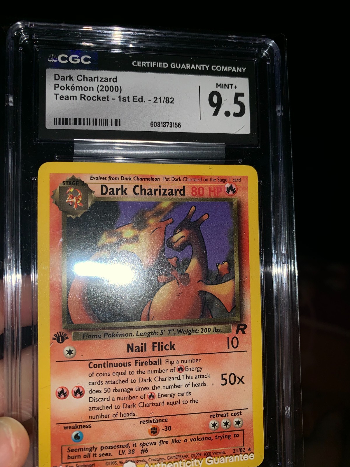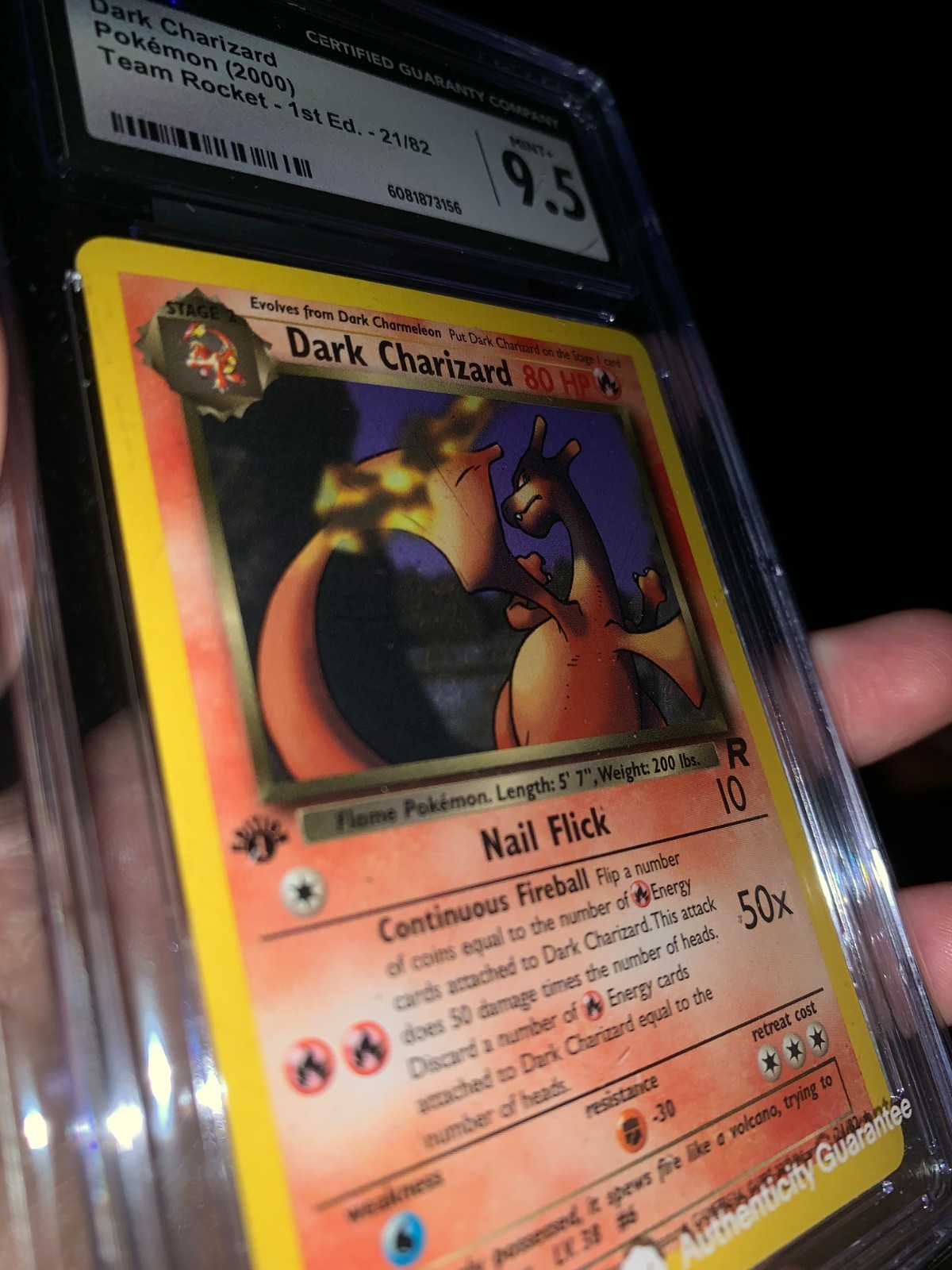 The Dark Charizard 21/82 Team Rocket Regular 1st Edition card from the Pokémon TCG is a highly sought after collectible featuring the iconic character in a rare Dark attribute. Graded a near-perfect 9.5 by CGC, this card is a valuable addition to any collector's deck. With its striking artwork by Ken Sugimori and its rarity as a 1st Edition card, this Dark Charizard is sure to impress fans and investors alike.
