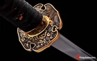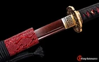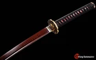 Product Parameter: Name: 鬼切 (QQ21) Swordsmith: 吉 久 正 一 Material: Folded T10 steel 15 times(32768 layers),Damascus folded steel,百炼钢 Overall: 103cm/ 40.6" Blade: 70cm/ 27.5'' Handle: 26 cm/ 10.24'' Widdth: 3.2 cm/ 1.26'' Thickness: 0.7cm/ 0.28'' Blade Color: Red & Black HRC(hardness): 58 Bo-Hi: Yes, with blood groove Samegawa: Red rayskin Fittings: Top grade brass Saya: Wooden sheath + Unique PU leather Tang(nakago): Full-tang , 2 bamboo menuki vertically fixed handle, very firm Pakage Include: 1 sword + 1 bag + 1 certificate Craft: Hand folded and forged, oil quenching treatment, Hand-polishing, electroplating color,etc. * The steel we use is not the normal steel with the truck or cars or other life electrics, the steel use for the blade contents much more carbon and the purity can not be comparable . * It's a functinonal sword. After test, You can use it to cut bamboo, A4 paper and water bottles,etc. Tsuba & Fuchi & Kashira & Habaki Saya Additional Service About us Delivery details Tsuba & Fuchi & Kashira & Habaki Alloy Tsuba Iron Tsuba ( extra $10) Brass Set ( extral $50 ) Alloy Fuchi & Kashira Habaki TSUKA-ITO & SAGEO Tsuka-ito is the wrapping of the tsuka and sageo (下緒 or 下げ緒) is a hanging cord that is passed through the hole in the kurigata (栗形) of a Japanese sword's saya. SAMEGAWA Samegawa(鮫皮)is the ray or shark skin wrapping of the tsuka (handle/hilt). Saya Please contact us before placing an order to see if there is any stock available, as well as any additional charges. OX Horn Saya Additional Service It's free for engraving English words, Chinese Characters and Japanese Kanji , etc. You need pay extral $20-30 for engraving patterns. Hamon We can add or remove the machine-made wavy hamon for free. Bo-hi ( Blood Groove) Usually thought be used for bloodletting only. It is also used to lighten the weight of the sword. We can add or remove Bo-hi for free Sharpness Most of our blades are sharp. We can also make the blade unsharpened for free if you require. Colored Blade If you want to change to a different color blade, please contact us before purchase. Matching Swords Set If you buy one katana, we can make a matching Wakizashi or Tanto for you. The price varies from different swords. Please contact us if you need make custom matching set. About us We have our own sword-casting factory. The factory is located in Longquan, a small town with a long history of sword-casting in China. Most of the famous Swords in China are made there. Rich raw materials, skilled technology, traditional sword casting technology from generation to generation. Manual production really takes a lot of time. We will prepare most products in advance ,and arrange delivery within about a week. However, sometimes the delivery time is delayed due to weather or raw materials,etc. we hope to get your understanding. Feel free to contact us to inquire about the status of your order. Each handmade sword is unique. Our swords are great for gifts or for your own collection. Our swordsmithing master makes every sword attentively, hope you can feel our sincerity. We will also give you the best customer service, any questions please feel free to contact us. Delivery details a) Import duties, taxes and charges are not included in the item price or shipping charges . These charges are the buyer’s responsibility. b) If you do not receive the package, or the package is damaged during transportation. We'll take care of it. Please feel free to buy. c) If it is mentioned in the product description that the package includes the sword bag or sword holder , the style will be random. The sword holder or sword bag on the ebay picture is the props we use for shooting. If you really like a style, please contact us before buying. d) If you have any problem after recieve the package (wrong size, wrong style, etc.). We always provide you with the best after-sales service. Please give us a chance to help you before you give us a bad feedback . Thank you very much!