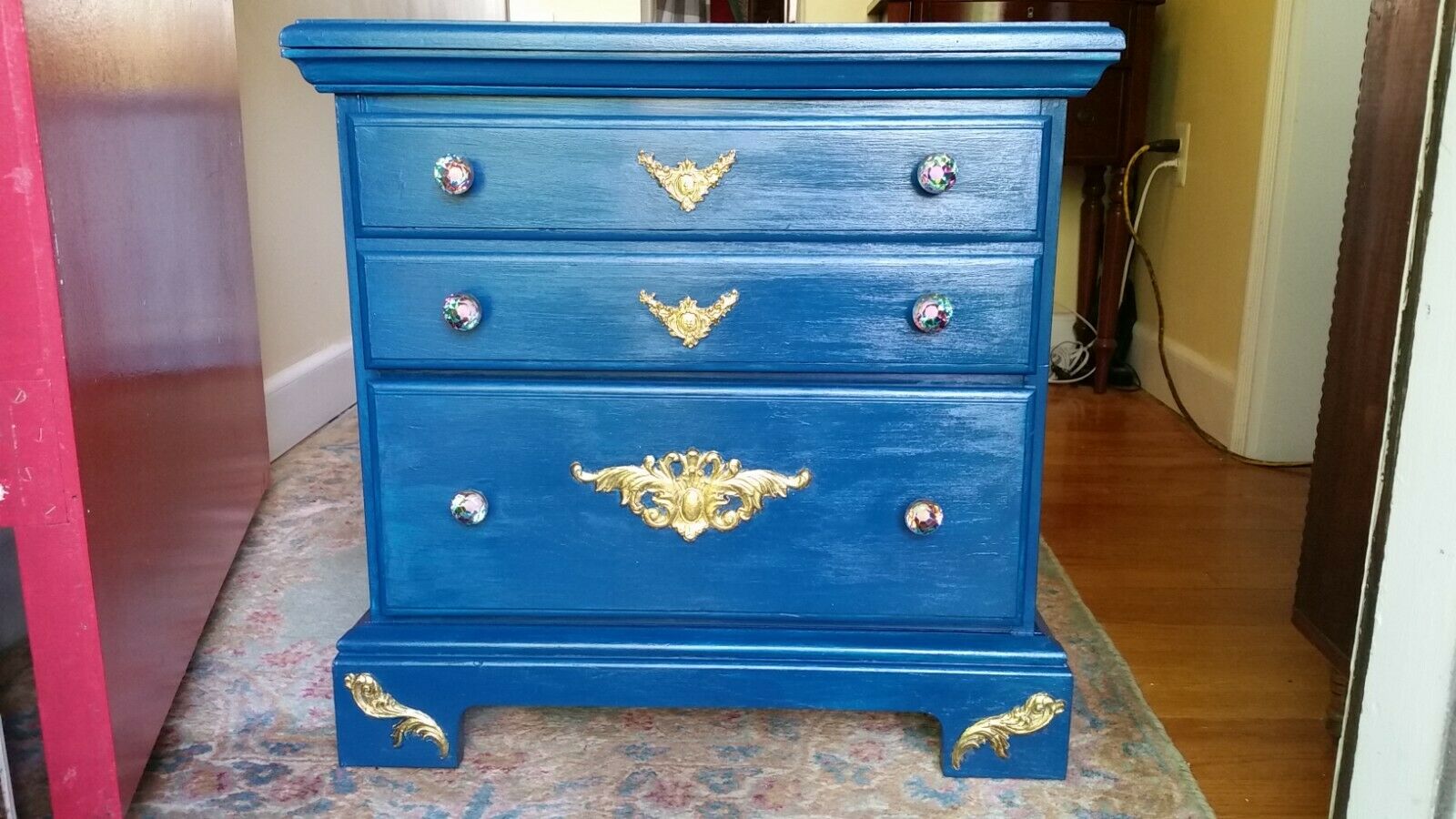 Dark blue /turquoise nightstand, or a side table. This piece is hand-stained with decorative ornaments highlighted in gold. Knobs are multi-faceted glass, which changes color depending on the light. It has 3 drawers.