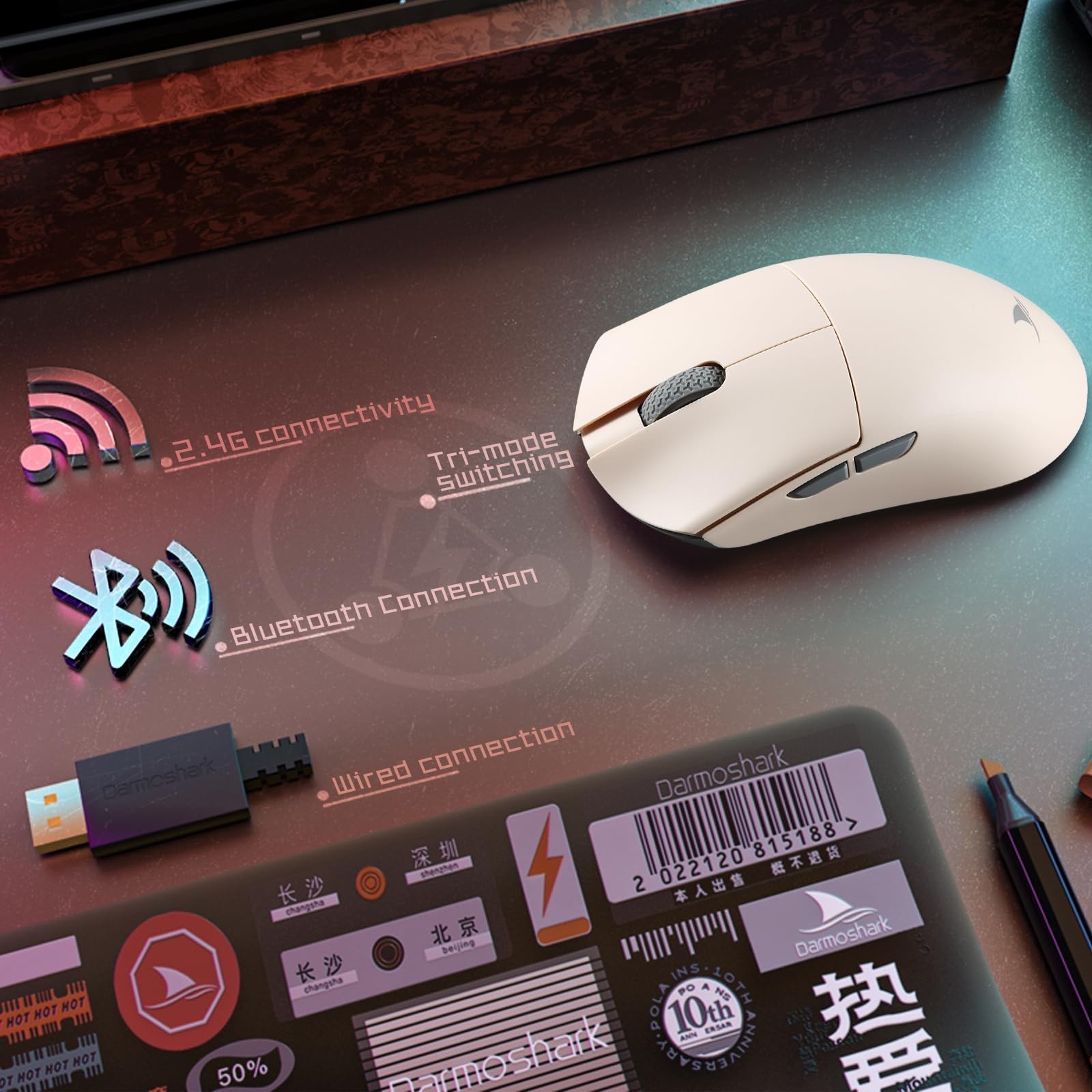 Darmoshark M3 Wireless Gaming Mouse,Tri-Mode 2.4G/USB-C/Bluetooth Mouse Up to 26000DPI,PAW3395 optical sensor Lightweight 58g,5 programmable button 500MAh Battery Life,Computer Mouse for Laptop,PC,Mac Product Details Size: M3 Color: Pink Brand: Darmoshark MPN: DMM3-camel colorbr UPC: Does not apply EAN: Does not apply Brand: Darmoshark Color: Pink Connectivity Technology: Bluetooth Special Feature: Wireless Movement Detection Technology: Trackball Package Dimensions: 7.72 x 5.04 x 2.4 inches Item Weight: 2.05 ounces Item model number: DMM3-camel colorbr Date First Available: June 21, 2023 Manufacturer: Darmoshark Country of Origin: China Latest Three Modes Connection:Darmoshark wireless gaming mouse supports three connection modes to meet various user scenes. Switch to the 2.4G mode and Bluetooth mode when playing games to save you the trouble of data cables and get longer battery life. If it is not enough, you can also switch to the traditional wired mode using the attached charging USB-C data cable. A maximum of 3 devices can be connected at the same time. Such games are very suitable for multi -device work PAW3395 Sensor:Darmoshark wireless gaming mouse adopts top 3395 sensor, up to 26000 DPI resolution, 650 IPS tracking speed, response speed can reach 1000Hz, 50G acceleration, faster and more accurate than ordinary mouse, is committed to providing PC gamers the best Gaming experience Programmable Game Mouse:Support 5 -programming keys, download software can set DPI, key function, player macro settings 58g Ultralight Gaming Mouse:Pure right-handed ergonomic design, durable and light weight, perfect body design takes good care of various grip hand shapes and easily supports the palm of the hand. Perfect for reducing palm sweating and wrist fatigue during long-term use Reliable Wired & Wireless Options:The gaming mouse features both wired and wireless options. Whether you prefer zero-lag wired connections or the convenience of Bluetooth, you're catered for