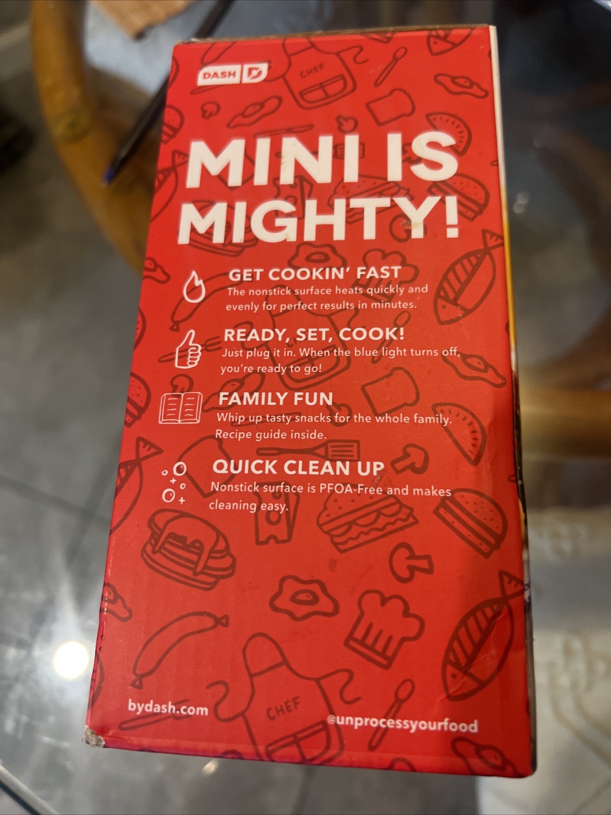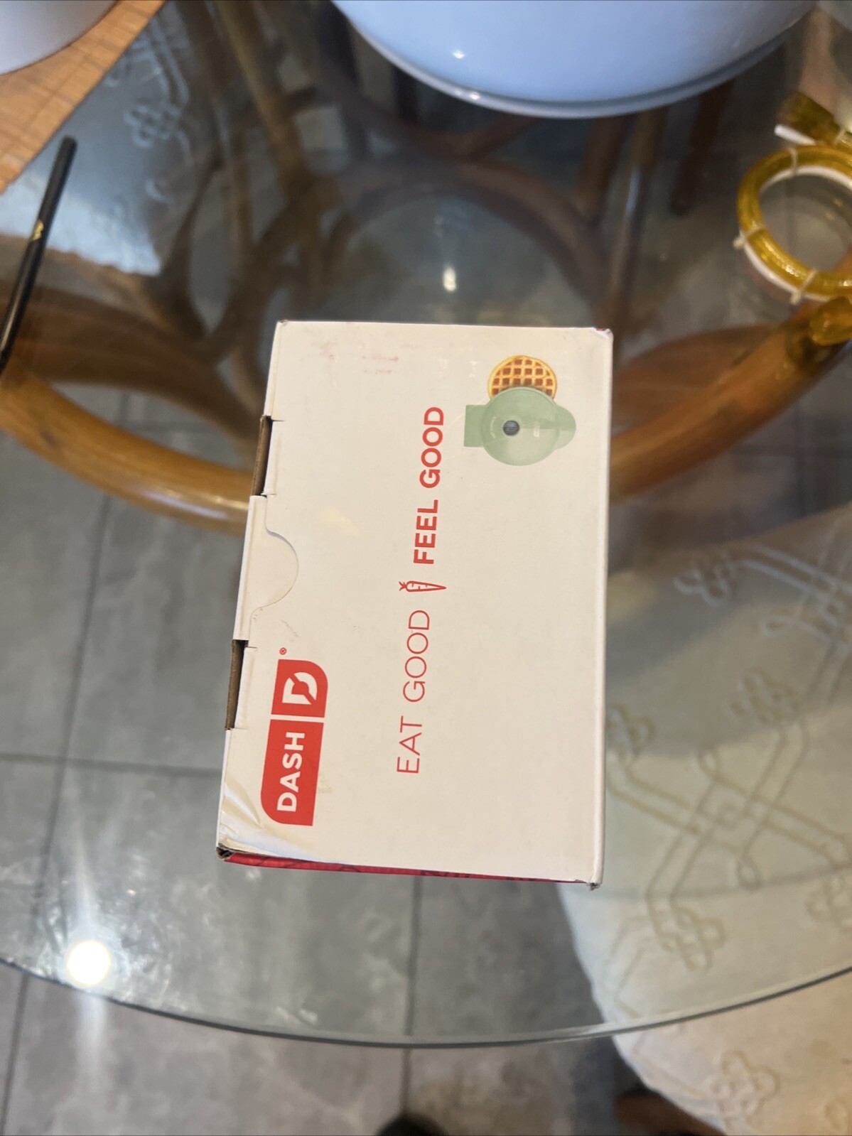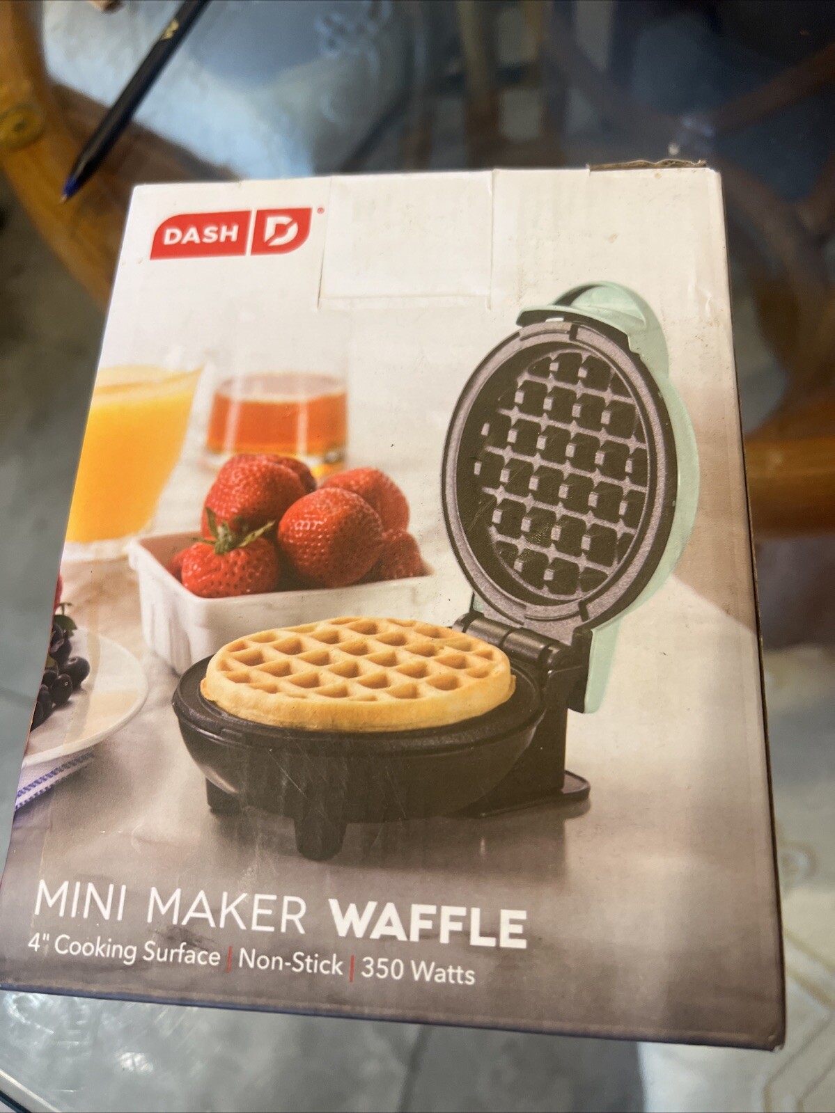 The Dash Mini 4" Inch Non-Stick Waffle Maker in Aqua is a compact electric waffle maker with a round shape. It has a power of 350W and features indicator lights, a heat-resistant handle, removable plates, a timer, and a non-stick interior for easy cleaning. This standard waffle maker has a capacity for one waffle and comes with a non-stick pan, recipes, and an instruction manual. Made of plastic, it is designed for convenient waffle making.