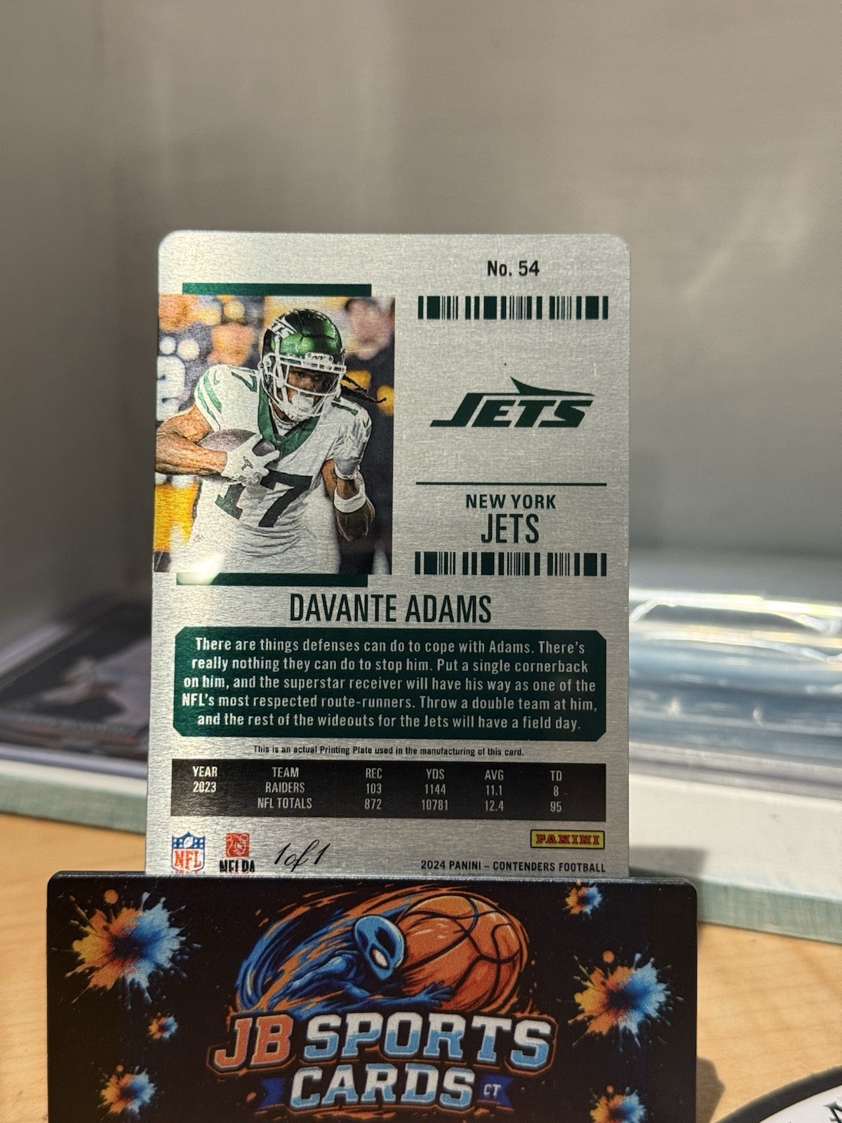 The product is a highly collectible 2024 Contenders FOTL 1/1 Printing Plate trading card featuring Davante Adams from the National Football League (NFL). This original card manufactured by Panini is made of card stock and is serial numbered, making it a rare and unique piece for fans and collectors. The card is in excellent condition and represents a special edition from the 2024 season, perfect for football enthusiasts and enthusiasts of sports trading cards.