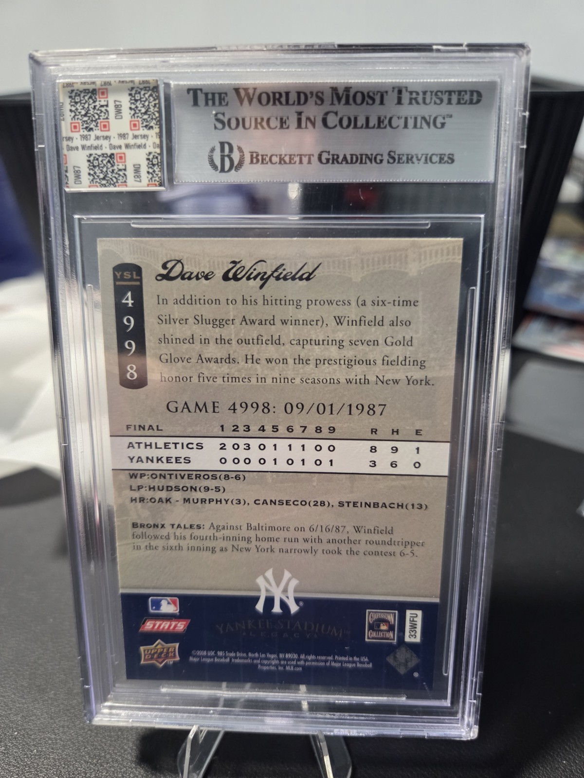 The product is a 2008 Upper Deck trading card featuring a game-used patch of Major League Baseball player Dave Winfield. This card is graded as a 9 Mint by Beckett Grading Services, ensuring its authenticity and high quality. The card belongs to the Yankee Stadium Legacy set and includes a jersey fusion element, adding to its collectible value. Perfect for baseball fans and memorabilia enthusiasts, this card showcases a piece of sports history from one of the New York Yankees' legendary players.