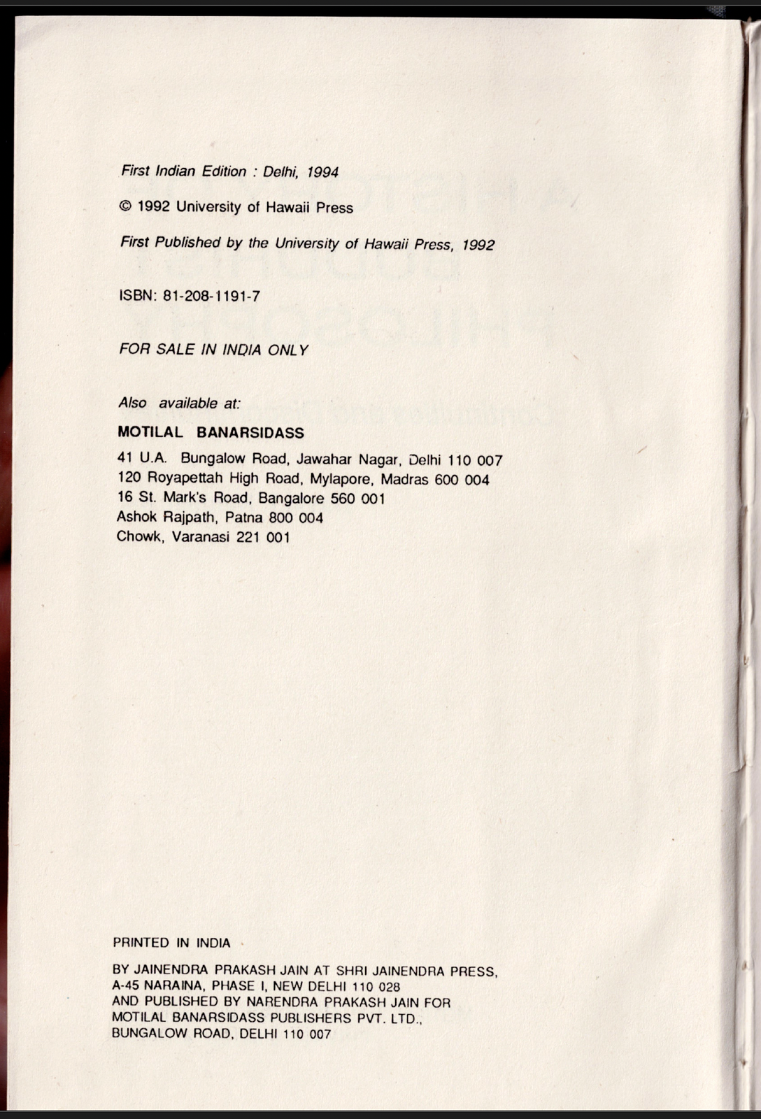 A History of Buddhist Philosophy ; by David Kalupahana - Hardcover Book A History of Buddhist Philosophy ; by David Kalupahana - Hardcover Book This copy is in GOOD used condition overall. The dust-jacket has a light marks and some wear (see scan). The boards are in good order, the upper corner has a light bruise. The binding is in very good order. The pages DO NOT have any names, inscriptions or marking of text, there are some stamps on the first, free endpaper (see scan). Click here to visit PATRICK ANDREAS QUALITY BOOKS Store Home Page . Listing and template services provided by inkFrog