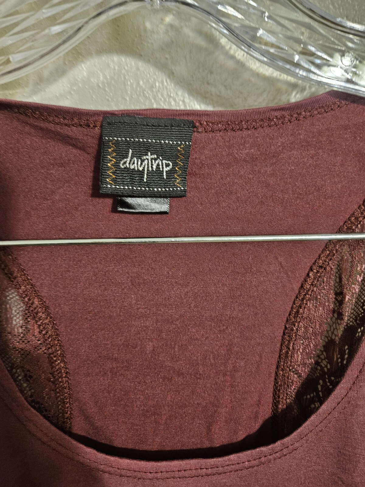 DayTrip Womens Burgundy Tank Top With Lace Size XL Condition is listed in the condition description. Feel free to look at the pictures for better understanding of the condition. Thank you for considering this item.