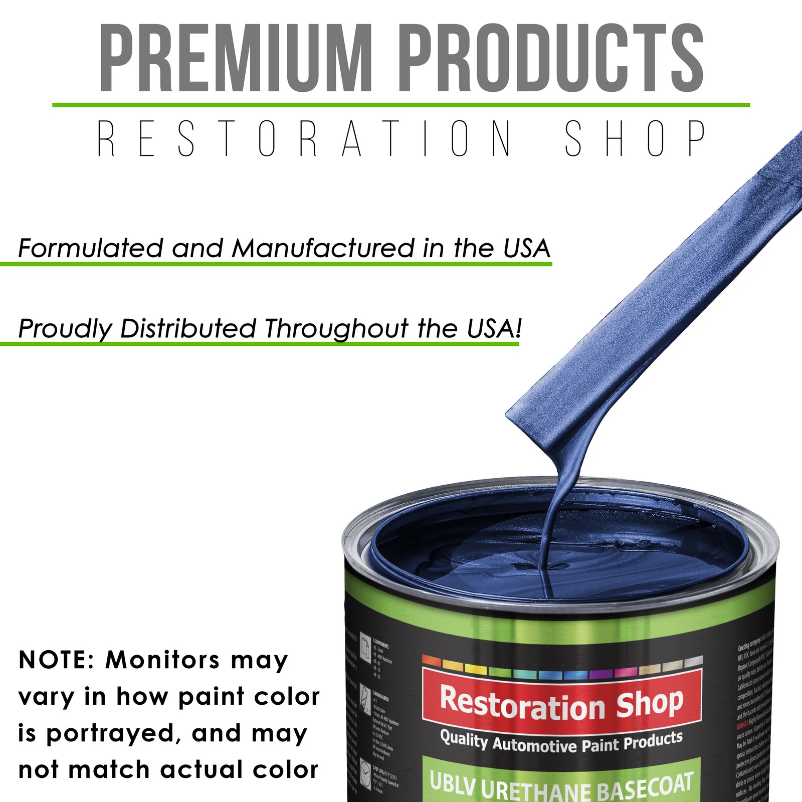 TCP Global Ebay Storefront Ordering | Shipping | Returns | International Product Information FLAMMABLE/HAZARDOUS ITEMS ARE SHIPPED VIA UPS GROUND/STANDARD TO THE LOWER 48 U.S. STATES & CANADA. ***SHIPPING VIA U.S. POSTAL SERVICE OR TO A P.O. BOX IS NOT AVAILABLE.*** RUSH AIR SHIPPING IS AVAILABLE IN CONTINENTAL U.S. FOR AN ADDITIONAL HAZMAT AIR SHIPPING CHARGE. CONTACT US PRIOR TO ORDERING FOR AIR SHIPPING QUOTE. IF ORDER IS PLACE FOR AIR SHIPPING YOU WILL BE CONTACTED FOR ADDITIONAL SHIPPING PAYMENT. INTERNATIONAL SHIPPING IS AVAILABLE. CONTACT US FOR SHIPPING QUOTE PRIOR TO ORDERING. Part# RSP UBLV2519-KIT-Q-P Daytona Blue Metallic - LOW VOC Urethane Basecoat with Premium Clearcoat Auto Paint (Complete Medium Quart Paint Kit) Professional Automotive Coating Complete 1 Quart Restoration Shop - Low 3.5 VOC Urethane Basecoat with Premium Clearcoat Auto Paint Kit with Medium Drying Reducer (Used when the ambient temperature range is 70-85Á F). The kit provides 1-1/2 Quarts of sprayable basecoat color material and 1-1/4 Quarts of Premium Clearcoat. UBLV Paint Kit includes 1 Quart of UBLV Low VOC Urethane Basecoat Paint Color, 1 Quart of XR70 Exempt Medium Urethane Reducer, 1 Quart of HS3010 Premium High Solids Ultra Clear, 1 Half-Pint of HS3030 Premium High Solids Hardener and a 3 Pack of 190 Micron Nylon Automotive Strainers. The Restoration Shop (UBLV) Low VOC Urethane Basecoat and Premium Clearcoat System is a State-of-the-Art High-Performance Professional Easy-To-Use Paint Coating System that is Designed to Reproduce the Hi-Tech O.E.M. Automotive Finishes Found on Today's Vehicles. UBLV is an easy to spray fast-drying basecoat/clearcoat system that provides a long-lasting and very high gloss topcoat finish result. UBLV is an extremely durable, chemical and solvent resistant coating that also resists chipping, cracking, and UV ray fading. Restoration Shop's (UBLV) is a Low 3.5 VOC compliant basecoat/clearcoat paint system that may be used in National Rule or Low 3.5 VOC limit States when using it with the proper XR series reducers. Note: Monitors vary - onscreen colors are for general color reference only. Restoration Shop (UBLV) LOW VOC URETHANE BASECOAT with PREMIUM CLEARCOAT - COMPLETE MEDIUM QUART PAINT KIT Includes: 1 - Quart of Restoration Shop Low 3.5 VOC Premium Urethane Basecoat Auto Paint Color 1 - Quart of Medium (70-85¡ F) Exempt Urethane Reducer (RSP XR70-GL) 1 - Quart of Custom Shop Series Premium High Solids Ultra Clear (RSP HS3010-QT) 1 - Half-Pint of Premium High Solids Hardener (RSP HS3030-HP) 3 - Each Premium 190 Micron Nylon Automotive Strainers UBLV Paint Color has a 2 to 1 Mixing Ratio, 2 parts UBLV Paint Color to 1 part XR Urethane Reducer. UBVL Basecoat color requires a 2 to 1 mix ratio with the included medium drying (70-85¡ F) XR exempt urethane reducer before spraying. Custom Shop Series Premium High Solids Ultra Clear (RSP HS3010) has a 4 to 1 Mix Ratio, 4 parts Urethane Clearcoat to 1 part Urethane Hardener A Low 2.1 VOC medium-solids (MS), 2K (two-component) polyurethane clearcoat formulated to offer ease of application and has great flow and leveling, excellent durability, exceptional gloss and good distinctness of image. This superior quality clearcoat is the professional's topcoat choice for use in today's high-end auto body shops. This clearcoat is used for overall application and is also used for spots and panels. The clearcoat is VOC compliant for all multi-stage topcoat systems, and can also be applied on top of other basecoat brands. Optional Reducers Available Separately XR Series Exempt Reducers to Maintain a 3.5 VOC Level: XR60 Exempt Fast Reducer 60-70¡ F; XR70 Exempt Medium Reducer 70-85¡ F; XR85 Exempt Slow Reducer 85¡ F and above Since 1974, Restoration Shop has been a Trusted Top Quality brand and The Source for Innovative Premium Quality Automotive Products! Restoration Shop Low VOC UB Urethane Basecoat is a state-of-the-art basecoat designed to reproduce the hi-tech O.E.M. finishes found on today's vehicles. It features outstanding coverage, rapid dry time, excellent metallic control and optimum repairability. UBLV provides an environmentally friendly solvent solution. View all categories Warehouse Locations San Diego, California South Carolina