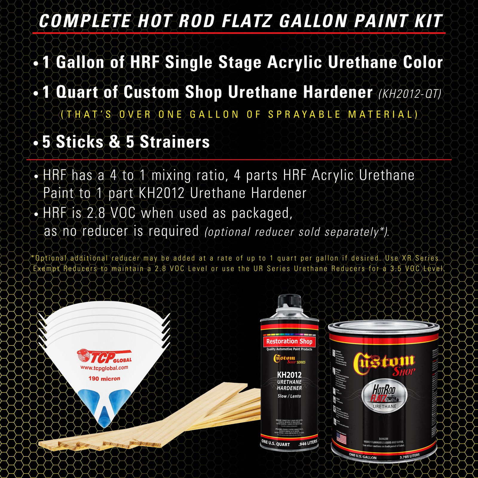 TCP Global Ebay Storefront Ordering | Shipping | Returns | International Product Information FLAMMABLE/HAZARDOUS ITEMS ARE SHIPPED VIA UPS GROUND/STANDARD TO THE LOWER 48 U.S. STATES & CANADA. ***SHIPPING VIA U.S. POSTAL SERVICE OR TO A P.O. BOX IS NOT AVAILABLE.*** RUSH AIR SHIPPING IS AVAILABLE IN CONTINENTAL U.S. FOR AN ADDITIONAL HAZMAT AIR SHIPPING CHARGE. CONTACT US PRIOR TO ORDERING FOR AIR SHIPPING QUOTE. IF ORDER IS PLACE FOR AIR SHIPPING YOU WILL BE CONTACTED FOR ADDITIONAL SHIPPING PAYMENT. INTERNATIONAL SHIPPING IS AVAILABLE. CONTACT US FOR SHIPPING QUOTE PRIOR TO ORDERING. Part# KUS KIT-HRF1401-M-GL Daytona Yellow - Hot Rod Flatz Flat Matte Satin Urethane Auto Paint - Complete Gallon Paint Kit - Professional Low Sheen Automotive, Car Truck Coating, 4:1 Mix Ratio Complete 1 Gallon Custom Shop Hot Rod Flatz Acrylic Urethane Auto Paint Kit. The kit provides 5 quarts (1 gallon + 1 quart) of sprayable material. It has a 4 to 1 mix ratio and is 2.8 VOC when used as packaged, as no reducer is required (optional XR & UR series reducers sold separately). Paint Kit includes 1 Gallon of Hot Rod Flatz Single Stage Acrylic Urethane Paint Color, 1 Quart of Custom Shop Urethane Hardener (KH2012-QT), 5 Pack of 190 Micron Nylon Automotive Strainers, and a 5 Pack of Wood Paint Mixing Sticks. Hot Rod Flatz Acrylic Urethane System is a high-performance professional, easy-to-use single-stage paint coating system designed for overall automotive refinishing. No clearcoat is required or recommended. Pre-flattened ready to spray low-gloss color with a consistent satin sheen with the desired 30-degree satin primer appearance. A very durable, chemical, and solvent-resistant coating that also resists chipping and cracking and contains UV inhibitors to protect your finish from fading and chalking like traditional primers. Custom Shop Products are Made in the U.S.A., and we formulate, manufacture, and distribute our products throughout the USA. Our superior coating products only use the highest quality ingredients, which allows our customers to achieve consistent, high-quality professional results on all their painting projects! Complete Sprayable Gallon Kit Complete 1 Gallon Custom Shop Hot Rod Flatz Acrylic Urethane Auto Paint Kit. The kit provides 5 quarts (1 gallon + 1 quart) of sprayable material. It has a 4 to 1 mix ratio and is 2.8 VOC when used as packaged, as no reducer is required (optional XR & UR series reducers sold separately). Paint Kit includes 1 Gallon of Hot Rod Flatz Single Stage Acrylic Urethane Paint Color, 1 Quart of Custom Shop Urethane Hardener (KH2012-QT), 5 Pack of 190 Micron Nylon Automotive Strainers, and a 5 Pack of Wood Paint Mixing Sticks. Hot Rod Flatz Acrylic Urethane System is a high-performance professional, easy-to-use single-stage paint coating system designed for overall automotive refinishing. No clearcoat is required or recommended. Pre-flattened ready to spray low-gloss color with a consistent satin sheen with the desired 30-degree satin primer appearance. A very durable, chemical, and solvent-resistant coating that also resists chipping and cracking and contains UV inhibitors to protect your finish from fading and chalking like traditional primers. Custom Shop Products are Made in the U.S.A., and we formulate, manufacture, and distribute our products throughout the USA. Our superior coating products only use the highest quality ingredients, which allows our customers to achieve consistent, high-quality professional results on all their painting projects! View all categories Warehouse Locations Las Vegas, Nevada South Carolina