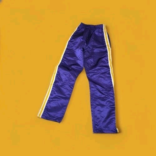 CLASSIC DELONG BREAK AWAY WARM-UP PANTS NYLON CONSTRUCTION WITH A SHINY SATIN LIKE LOOK / FEEL PLEATED FRONT ACCENTS PURPLE IN COLOR WITH YELLOW AND WHITE ACCENT SIDE STRIPES PERFECT FOR THE LA LAKERS / LSU TIGERS / MN VIKINGS AND SEVERAL OTHER SPORTS TEAMS! UNISEX ADULT SIZING - TAGGED LARGE 32-36" STRETCH FIT WAIST 31.5" INSEAM