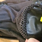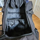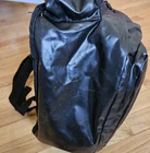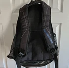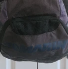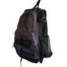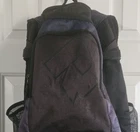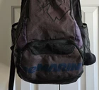 DeMarini Backpack Overall good pre-owned condition, few scratches on bottom and small hole on bottom on exterior mesh water bottle pocket Main compartment has divider. Also another large compartment with zipper, smaller compartment with zipper in front and small zipped pocket for keys and small items on top near handle, mesh pockets on each side with hook and loop strap above it (to hold bats). Color is charcoal/black with blue/purple snakeskin accents, material feels like a vinyl canvas Padded along surface worn against back Measures about 22 inches in length, 13 inches wide, and can expand to 10 inches deep