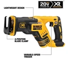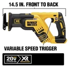 About This Product The DEWALT DCS367B 20-Volt MAX XR Cordless Reciprocating Saw is a lightweight, compact saw designed to make cutting in between studs and in other tight spots easier than with traditional reciprocating saws. The brushless motor provides up to 2.5X more run time than other cordless saws to get the job done. With a 1-1/8 in. stroke length and a variable speed trigger delivering up to 2,900 strokes per minute, this DEWALT reciprocating saw is fast and efficient. It also features a keyless, lever-action 4-position blade clamp for quick and easy blade changes in 4 directions for a variety of applications including flush cutting. The cordless reciprocating saw has a bright LED light with spotlight mode to illuminate dark and enclosed work areas. Tool only. Battery pack and charger sold separately. Highlights Up to 2.5X more runtime than previous cordless reciprocating saw models Compact 14.5 in. L fits in between studs and in other tight spots other saws can't reach 1-1/8 in. stroke length Variable speed trigger delivers up to 2,900 SPM Bright LED light to illuminate dark work areas