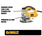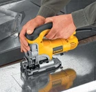 This DEWALT Jig saw features a 6.5 Amp motor so you can make fast cuts through hardwoods, thin gauge metals, plastics and fiberglass. With its 4-position orbital operation, you can choose smooth or aggressive cutting depending on the application. The jigsaw features a variable speed of up to 3100 SPM for optimal cutting speed during all applications. Motor delivers high cutting power for the most demanding materials Extra large blade clamp lever is easily accessible on the front of the unit Lever-action, keyless blade change makes projects quicker and easier Base plate tilts allow bevel cuts of up to 45 degree Adjustable shoe for cutting stability No-mar shoe cover helps protect materials from scratching Top handle with trigger switch offers a solid grip and control All-metal gear case provides added durability 8 ft. power cord UL and CSA listed California residents see Prop 65 WARNINGS Product Information Internet # 100618995 Model # DW331K Store SKU # 217666 Floor Id
