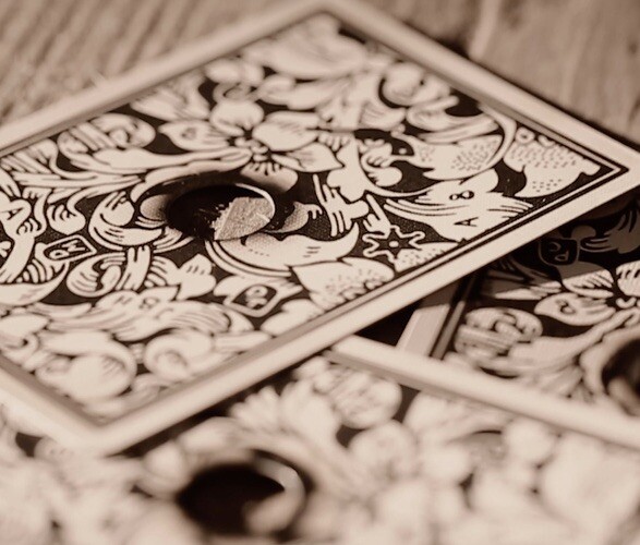 This is a pair of decks; the ORIGINAL Dead Man’s Deck, and the second version of it. Neither is the “unharmed” version. They were NOT sold plastic wrap on the tuck box. Please note that the v1 tuckbox has a stray drop of ink in the upper right corner from the factory, as shown in the close-up photo. Sure be a conversation starter, these cleverly done and totally unique decks are based on the infamous death of James "Wild Bill" Hickock, a Civil War veteran and celebrated gunfighter. Wild Bill was shot in the back during a poker game before he could play his hand...and legend has it that he held Aces and Eights: The Dead Man´s Hand. Each of the morbid cards in this deck has a bullet hole straight through its middle, and the infamous "Dead Man’s Hand” is splattered with bloody red ink. The design is true to the time period, with an ornate, grey pattern and old-style faces. Please check my other listings for many sought-after collectible poker decks including rarities from Stockholm 17, Lotrek/Oath, Bicycle, and Kickstarter exclusives. Thank you!