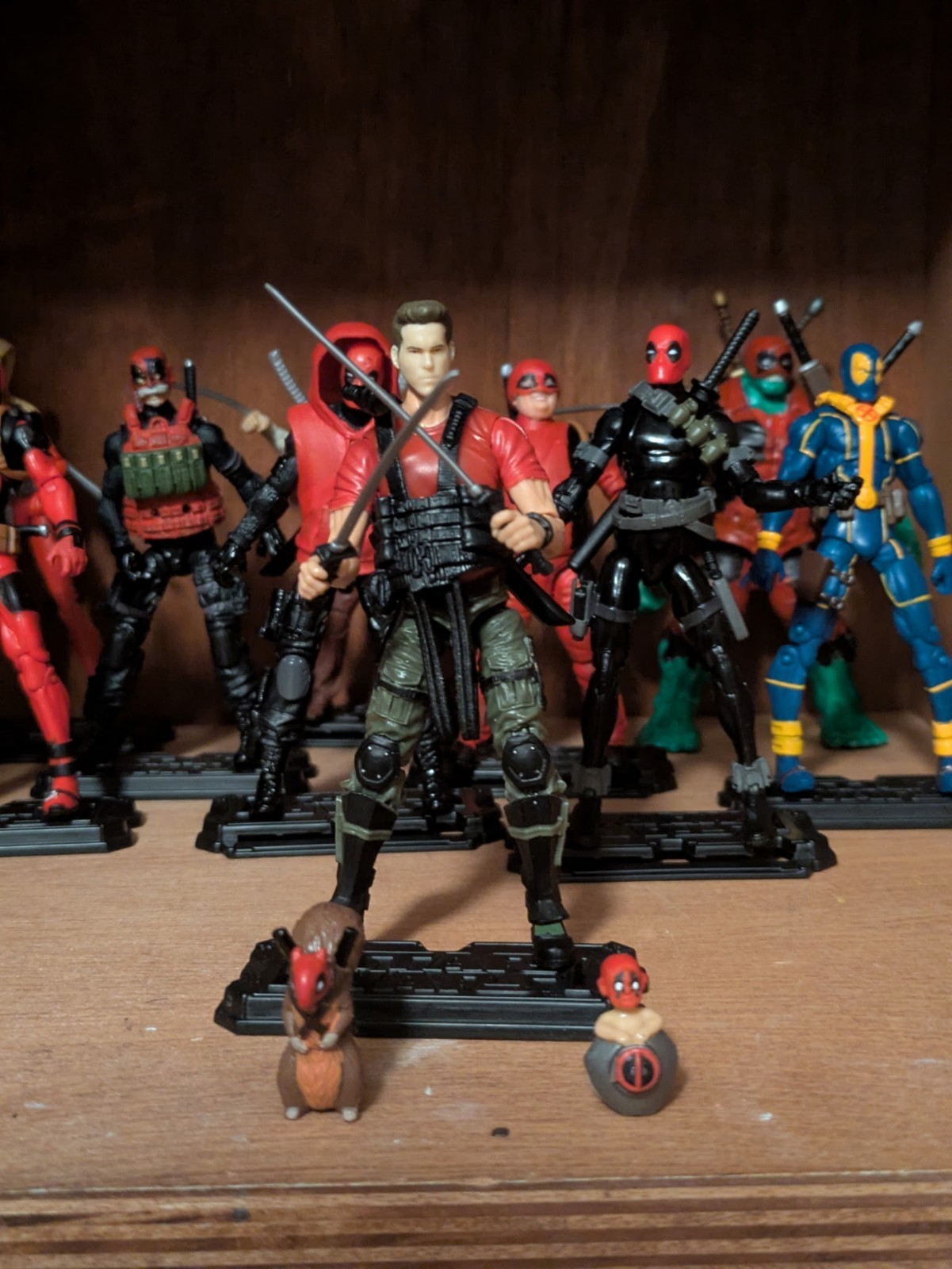 Deadpool (family, corps,team) ? Whatever you want them to be... Lol you have nice pool, wade Wilson before cancer, hulk pool, Grandpa pool, cousin pool, teenpool, baby pool, X-Men blue suit Deadpool, weaponXI from wolverine origins movie, lady pool, fat pool and squirrel pool. All come with weapons you see and stands You see!