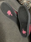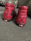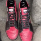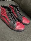 The "Deadpool Vans" are a pair of pre-owned VANS SK8 high-top sneakers in a unique red and black colorway inspired by the Marvel character Deadpool. These athletic shoes are designed for men and feature a distinctive Deadpool theme, making them a standout piece for any sneaker collection. With a size of 8.5, these Vans combine style and comfort, perfect for fans of both the VANS brand and the Deadpool character.