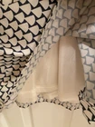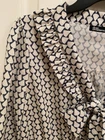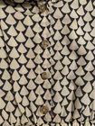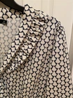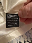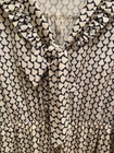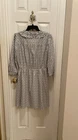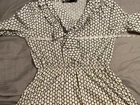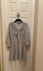 This is such a cute dress in the mod style. It definitely gives retro, pinup, rockabilly vibes. It features a cute “pussy bow” or “secretary bow” at the neckline. Adorable pleated neckline. Elastic waist. Buttons up the front of the bodice. The print is an ivory tear drop abstract design against a grayish or maybe even Sage green background. That shade is difficult to describe. I have attached a photo in direct sunlight as the last photo. Polyester spandex blend. Skirt lining is 100% polyester. Three quarter length sleeves with button at the cuff. Slight shoulder pouf. See photos. Approximate measurements are in the photos. Please review for an accurate fit.