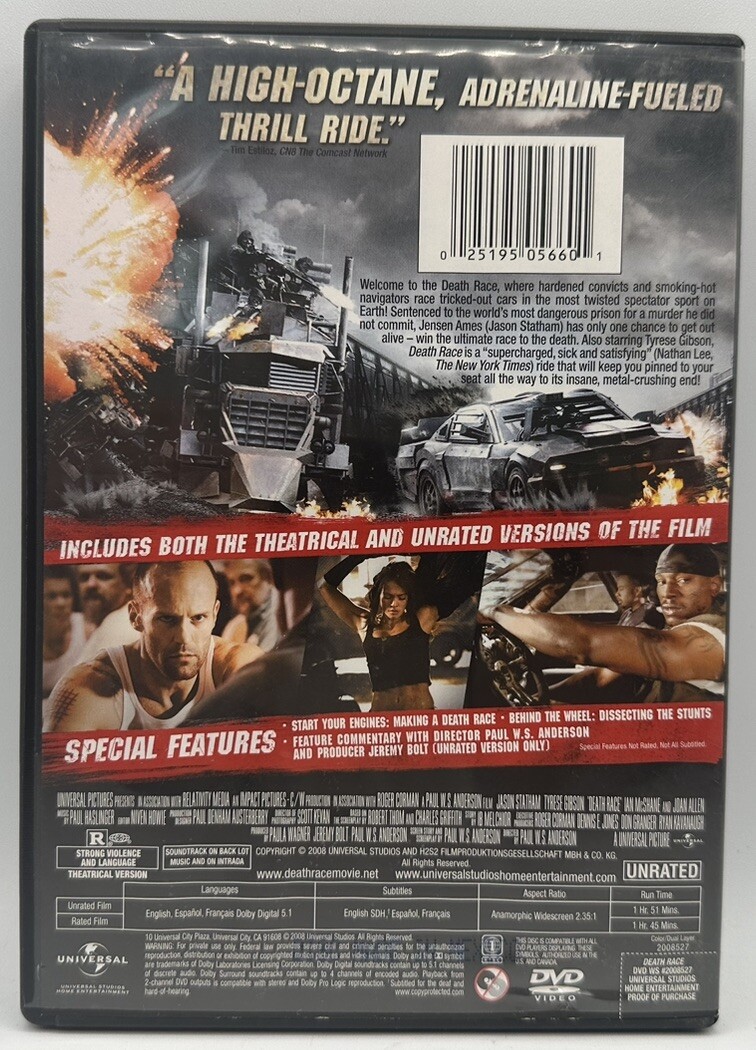 Experience the thrill of the action-packed movie, Death Race, on DVD. Starring Jason Statham and Tyrese Gibson, this unrated edition is a must-have for fans of the cult cinematic movement. The DVD features an NTSC video format, tall/DVD case, and a region code of DVD: 1 (US, Canada...). This movie is rated NR and has a runtime of 1 hour and 51 minutes. The DVD includes special features such as commentary, behind the scenes featurette, and widescreen format. The movie is subtitled in English, French, and Spanish, and has a sub-genre of filming, mystery, and chase. Directed by Paul W S Anderson, this movie is a perfect addition to your collection of action, adventure, and sci-fi & fantasy genres.