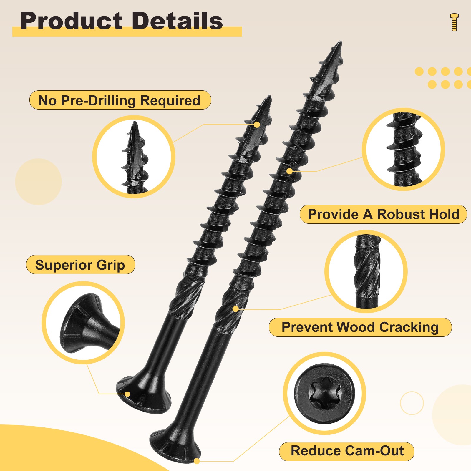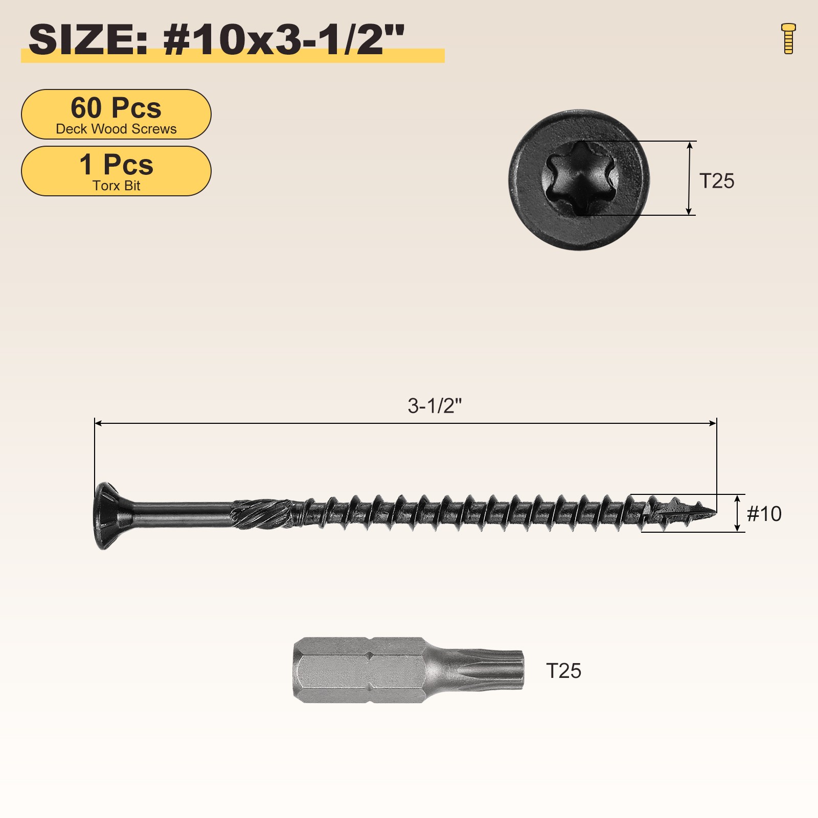 Document APPLY TO - This versatile deck screw is suitable for a wide array of wooden applications, including but not limited to patios, fences, frames, farm structures, ladders, outdoor furniture, pet houses, doors, tables, chairs, shelves, and workbenches. SPECIFICATION:Screw Size: #10x3-1/2"(Thread Dia x Length)Tail Type: Type 17Slot number: T25Color:BlackMaterial: Carbon SteelQUANTITY INCLUDED - 60Pcs x Deck Wood Screws; 1Pcs Torx BitADVANTAGE - Constructed from carbon steel with an advanced anti-corrosion treatment, these screws exhibit superior resistance to rust and corrosion. They have been tested for 1000 hours under salt spray conditions, ensuring reliable performance in both extreme heat and cold. This makes them highly durable and long-term use in various environments.DESIGN - The star drive design ensures a secure grip, minimizing the risk of slippage during installation and removal. The fine-point 17-gauge tip allows for effortless penetration into different types of wood, including hardwoods, softwoods, and pressure-treated materials. Additionally, the coarse serrated threads, and damping knurled shoulder and tail cutting design provide a robust hold, reducing board separation and enhancing overall structural stability.Note - Before purchasing, it’s recommended to use a caliper to verify the correct size for precise measurements, as rulers or tape measures might not be accurate enough. Deck Screws(#10x3-1/2") 60Pcs,Carbon Steel Wood Screw with T25 Torx Drive,Black APPLY TO - This versatile deck screw is suitable for a wide array of wooden applications, including but not limited to patios, fences, frames, farm structures, ladders, outdoor furniture, pet houses, doors, tables, chairs, shelves, and workbenches. SPECIFICATION: Screw Size: #10x3-1/2"(Thread Dia x Length) Tail Type: Type 17 Slot number: T25 Color:Black Material: Carbon Steel QUANTITY INCLUDED - 60Pcs x Deck Wood Screws; 1Pcs Torx Bit ADVANTAGE - Constructed from carbon steel with an advanced anti-corrosion treatment, these screws exhibit superior resistance to rust and corrosion. They have been tested for 1000 hours under salt spray conditions, ensuring reliable performance in both extreme heat and cold. This makes them highly durable and long-term use in various environments. DESIGN - The star drive design ensures a secure grip, minimizing the risk of slippage during installation and removal. The fine-point 17-gauge tip allows for effortless penetration into different types of wood, including hardwoods, softwoods, and pressure-treated materials. Additionally, the coarse serrated threads, and damping knurled shoulder and tail cutting design provide a robust hold, reducing board separation and enhancing overall structural stability. Note - Before purchasing, it’s recommended to use a caliper to verify the correct size for precise measurements, as rulers or tape measures might not be accurate enough. Hot Item Payment 1.We accept eBay payment . 2.Payment must be received within 7 business days of auction closing. Shipping 1.We ship to your eBay or Paypal address. Please make sure your eBay and Paypal address is correct before you pay. 2.Items will be shipped within 1-3 business day when we received payment. 3.Delivery time depends on destination and other factors. Description Policy Deck Screws(#10x3-1/2") 60Pcs,Carbon Steel Wood Screw with T25 Torx Drive,Black APPLY TO - This versatile deck screw is suitable for a wide array of wooden applications, including but not limited to patios, fences, frames, farm structures, ladders, outdoor furniture, pet houses, doors, tables, chairs, shelves, and workbenches. SPECIFICATION: Screw Size: #10x3-1/2"(Thread Dia x Length) Tail Type: Type 17 Slot number: T25 Color:Black Material: Carbon Steel QUANTITY INCLUDED - 60Pcs x Deck Wood Screws; 1Pcs Torx Bit ADVANTAGE - Constructed from carbon steel with an advanced anti-corrosion treatment, these screws exhibit superior resistance to rust and corrosion. They have been tested for 1000 hours under salt spray conditions, ensuring reliable performance in both extreme heat and cold. This makes them highly durable and long-term use in various environments. DESIGN - The star drive design ensures a secure grip, minimizing the risk of slippage during installation and removal. The fine-point 17-gauge tip allows for effortless penetration into different types of wood, including hardwoods, softwoods, and pressure-treated materials. Additionally, the coarse serrated threads, and damping knurled shoulder and tail cutting design provide a robust hold, reducing board separation and enhancing overall structural stability. Note - Before purchasing, it’s recommended to use a caliper to verify the correct size for precise measurements, as rulers or tape measures might not be accurate enough. Hot Item Payment 1.We accept eBay payment . 2.Payment must be received within 7 business days of auction closing. Shipping 1.We ship to your eBay or Paypal address. Please make sure your eBay and Paypal address is correct before you pay. 2.Items will be shipped within 1-3 business day when we received payment. 3.Delivery time depends on destination and other factors.