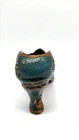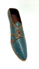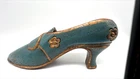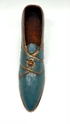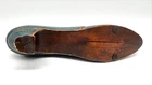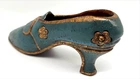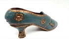 This is a small decorative sculpture of a Victorian style shoe, hand-carved from solid wood. The shoe measures 9 inches in length and features intricate carvings, showcasing the craftsmanship of the handmade piece. This unique item would make a charming addition to any collection of decorative figurines or could be displayed as a standalone piece in a home or office setting.