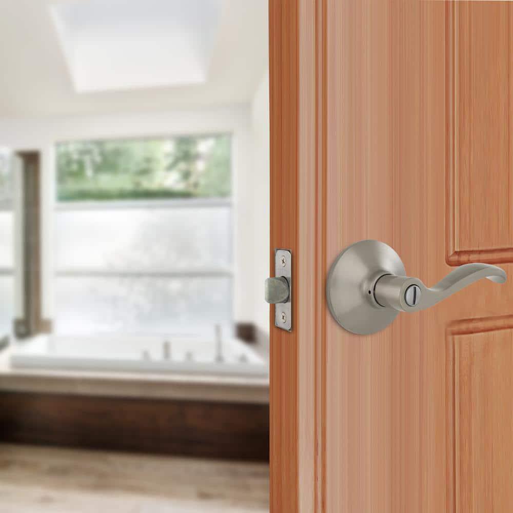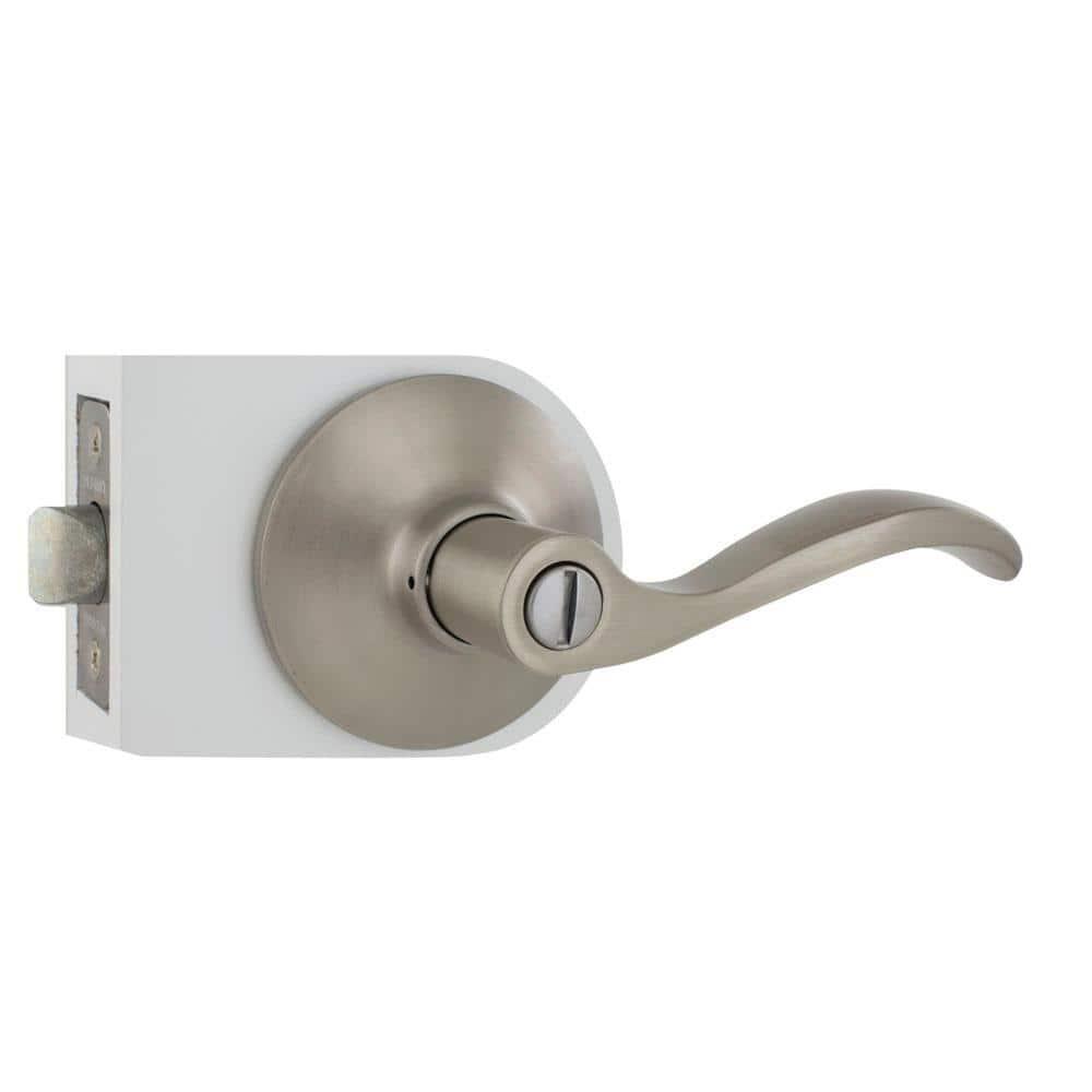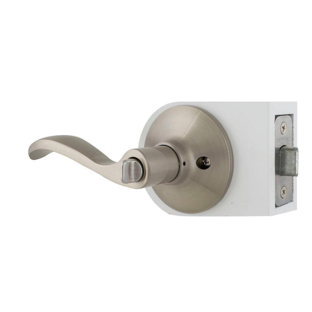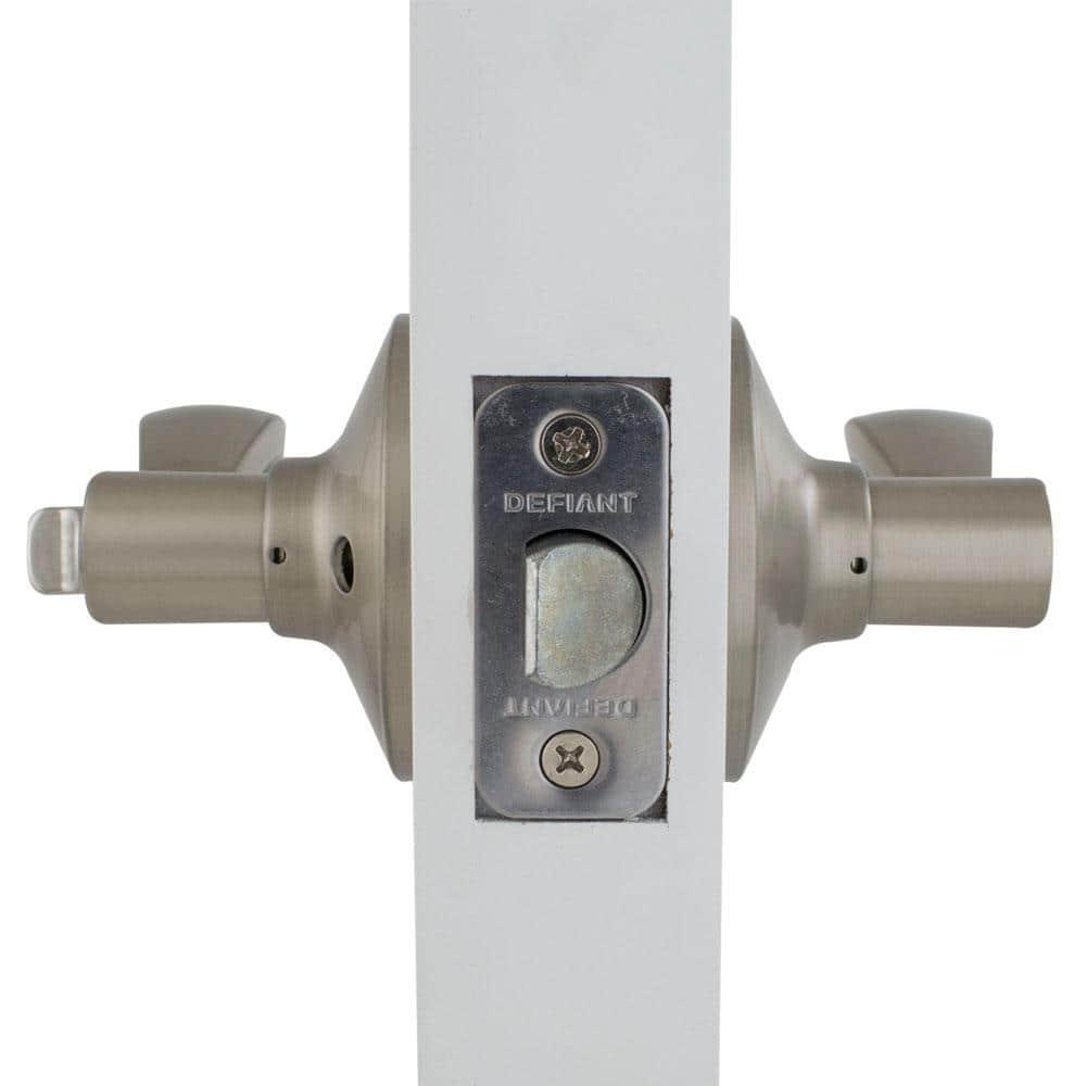 Defiant Privacy Door Handle Classic Adjustable Backset Easy Install Satin Nickel Easy to install using only a phillips head screwdriver New Larger Rose to cover blemishes from old hardware Affordably outfit latching interior doors with this lockable lever set from Defiant. The Naples Privacy lever easily mounts to doors 1-3/8 in. to 1-3/4 in. thick with the included hardware, perfect for bedroom and bathroom doors beyond which privacy is desired. It features a new 2.75 in. Rose, adjustable backsets and interchangeable faceplates for drive-in and traditional installations. Application Type: Privacy Commercial/Residential: Residential Door Handing: Universal Door Lock Style: Classic Door Locks & Knobs Product Type: Privacy Levers Features: Adjustable Backset,Easy Installation Finish: Satin Nickel Hardware Color Family: Nickel Hardware Finish Family: Nickel Included: Drilling Template,Hardware,Installation Instructions,Mounting Hardware Lever material: Zinc Lever style: Wave Lock Type: Unkeyed Material: Zinc Product Weight (lb.): 8.41 lb Returnable: 30-Day Strike: Round corner Assembled Depth (in.): 5.90 in Assembled Height (in.): 2.83 in Assembled Width (in.): 5.50 in Cross Bore Diameter (in.): 1 in Lever Grip Length (in.): 3.5 in Lever housing height (in.): 2.83 Lever housing width (in.): 2.83 Maximum Door Thickness (in.): 1.75 Minimum Door Thickness (in.): 1.375 Projection (in.): .49 Strike Height (in.): 2.25 Strike Width (in.): 1.75 Throw Length (in.): 0.5 in