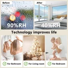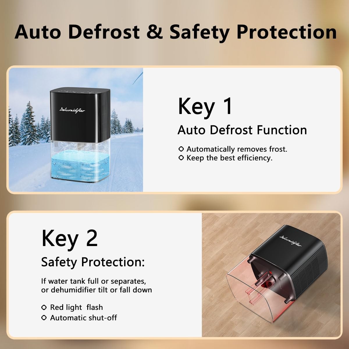 Dehumidifier 63OZ 1800ML Small Dehumidifier for Home Safety Dehumidification 5 Timers 3 Setting Modes Auto Shut Off Protection Adjustable 10 Color Lights Low Noise For Bedroom Bathroom 230 Ft² 🍀 1800ML Larger Capacity: dehumidifier has a lagre water tank, which holds up to 1800ML (63 OZ). So you don’t need to pour water frequently, saving you the hassle of constant checks. Let dehumidifier accompany you day and night, maintaining a gentle and constant dryness for your home! Please read the User Manual before using the product! 🍀 Defrosting and Safety Protection: Our dehumidifier is equipped with a defrost technology. It automatically removes frost from the semiconductor to make sure it works well. And with auto shut off protection, if water tank is full or separated, or the dehumidifier tilt or fall down, it will flash a red light to remind you and stop operation timely. 🍀 3 Setting Modes with Quiet Operation: There are three setting mode of this dehumidifier: sleep mode, normal mode and performance mode. It won’t produce noise over 40dB in sleep mode, so you can enjoy a peaceful sleeping at night. The normal mode and performance mode are more powerful for daily use. 🍀 10 Colors of Night Light and 5 Flexible Timer Options: There are 10 colors atmospheric lighting with clear water tank add unique touch to your life. Choose a timer from 24 hours, 48 hours, 72 hours, 96 hours or continuous operation to free your hands and save energy if necessary. 🍀 Stable and Compact Design: With stable and compact unique design, it’s not only suitable for adults, but also practical for the elderly and the children. It can be placed at your bathroom, living room, bedroom and other closed space. The dehumidifier is approved by FCC, CE and RoHS. Don't need to worry about accidents.