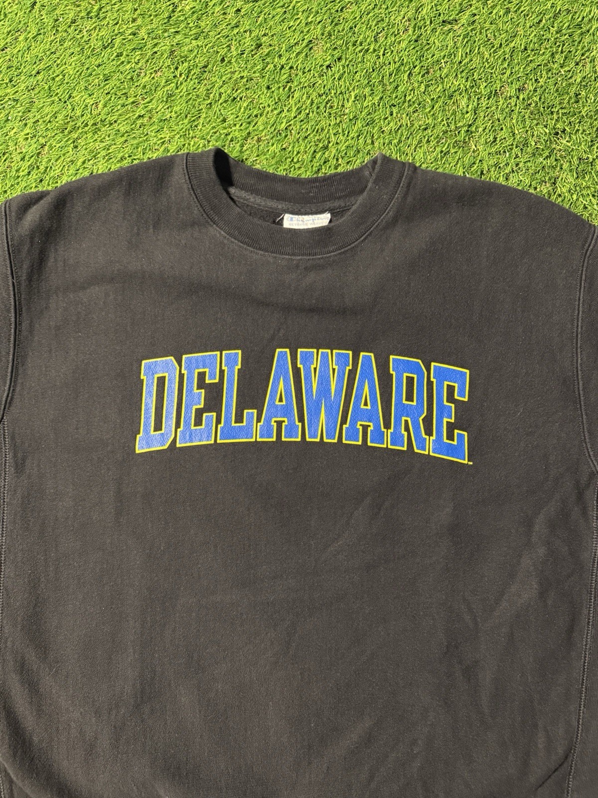 The Delaware Reverse Weave Champion Men’s Vintage Crewneck in size Large is a classic pullover sweatshirt featuring university of Delaware imprinted in the front . Made of a comfortable blend of polyester and cotton fleece, this black sweatshirt is lightweight and insulated, making it perfect for the winter, fall, and spring seasons. With a crew neck and long sleeves, this vintage Champion sweatshirt is ideal for outdoor activities like gym training, track and field, walking, weightlifting, and more. The 90s-inspired design adds a touch of retro style to your wardrobe. 📌 Please Buy at your own risk knowing description and pictures. If you have any questions regarding this piece please feel free to reach out !