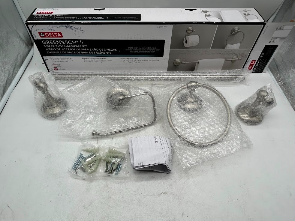 This is a NEW OPEN BOX item. The Greenwich II Bath Collection by Delta blends classic design with modern convenience , inspired by American casual décor . This 3-piece set includes a 24-inch towel bar, an open square toilet paper holder, and a round towel ring , making it an ideal upgrade for any bathroom. The SpotShield brushed nickel finish resists water spots, fingerprints, and stains, ensuring a clean and polished look for years to come. Key Features Complete 3-Piece Set – Includes a 24-inch towel bar, toilet paper holder, and towel ring for a cohesive and functional bathroom upgrade. SpotShield Brushed Nickel Finish – A warm, muted silver tone with earthy undertones , designed to resist water spots, fingerprints, and stains . Durable & Reliable – Crafted from multiple metals for strength and longevity . Wall-Mounted Design – Maximizes space while keeping towels and essentials easily accessible . Easy Installation – Includes all necessary mounting hardware, a template, and step-by-step instructions for a hassle-free setup . Dimensions Towel Bar: 2.76" H x 28.50" L x 3.49" D Toilet Paper Holder: 4.84" H x 6.45" L x 3.43" D Towel Ring: 7.53" H x 6.38" L x 2.74" D Why Choose the Greenwich II Bath Accessory Set? Provides a stylish and practical bathroom upgrade. SpotShield technology keeps hardware cleaner for longer . Durable construction ensures years of reliable use . Easy to install with included hardware and mounting template. Complete your bathroom with other coordinating pieces from the Delta Greenwich II Collection (sold separately) for a harmonized, modern look . We take great care to inspect all items and ensure they are accurately described. Should you have any issues with your purchase, please let us know immediately. We are committed to resolving any concerns promptly and to your satisfaction. Our small business truly appreciates your patronage.