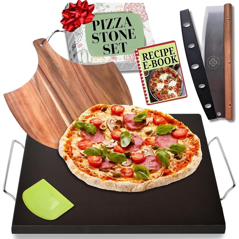 You may also like Heavy Duty Stainless Steel French Fry Cutter with Suction Feet for Potatoes 12.09 USD 12.73 USD Free shipping 5% off 8.9''Steak Mallet Meat Tenderizer Hammer Dual-Sided Heavy Duty Meat Pounder Tool 5.89 USD 6.2 USD Free shipping 5% off Bacon Wizard Microwave Crispy Bacon Maker - Crispier Healthier and Quicker! 9.39 USD 9.88 USD Free shipping 5% off 10 Pcs Measuring Cups and Measuring Spoons Set Stainless Steel Measure Cup Set 11.32 USD 11.92 USD Free shipping 5% off US Potato Fries Cutter One Step French Fry Vegetable Fruit Slicer Kitchen Tools 7.04 USD 7.41 USD Free shipping 5% off Cast Iron Dutch Oven 7.3Qt Enameled Cookware Oven Safe Heat Retention Easy Clean 52.49 USD Free shipping 14"Professional Stainless Steel Food Pizza Cutter Rocker Ultra Sharp Pizza Knife 5.95 USD 6.26 USD Free shipping 5% off Low Carb Peanut Butter Cups Dessert Treat 10 Ct Sugar Free Healthy Snack New 11.25 USD 11.84 USD Free shipping 5% off Floral Porcelain Cups & Saucers Set Vintage Style 6 Pieces Gift Boxed Tea Party 52.3 USD 56.24 USD Free shipping 7% off Ratchet Pipe Cutter for 8-29mm Pipes - Cuts Stainless Steel, Copper, Aluminum 12.08 USD 12.72 USD Free shipping 5% off Sneaker Stain Eraser Kit - Detergent Cleaner for Suede, Leather, and Rubber Shoe 4.78 USD 5.03 USD Free shipping 5% off Cheese Slicer Cutter Board Stainless Steel Wire Cutting Hand Tool w/Size Scale 12.29 USD 12.94 USD Free shipping 5% off About this item MAKE THE BEST PIZZA AT HOME: Elevate your pizza game with our pizza stones for oven and pizza making accessories. Transform your oven or BBQ into a pizza oven and create crispy crust pizzas just like your favorite Italian pizzeria. WON'T BREAK IN HIGH HEAT: Our deluxe pizza oven stone is designed for high temperatures up to 1500°F(815°C). Simply preheat the rectangular pizza stone in your oven or grill and it will last a lifetime. This durable construction makes it the perfect grill pizza stone for outdoor grill. 44cm x 34cm x 7. 5cm size. NON-STICK BAKING: Say goodbye to burnt bottoms and uneven cooking. Whether you're making homemade pizzas or heating up frozen ones, our bread stone for oven with handles ensures even heat distribution for perfectly cooked pizzas every time. Plus, cleaning up is a breeze with ceramic coated stones. EASY TO USE & VERSATILE: Beyond just pizza, our oven stones offer endless possibilities. Use it as nonstick baking stone for sourdough bread, biscuits, cookies, pastry, and more. The pizza peel doubles as a cutting board or serving tray, while the slicer effortlessly cuts your food cleanly and precisely. UNIQUE FOODIE GIFT: Designed with gift giving in mind, our custom box presents the perfect gift. Our pizza stone kits contain a stone pizza pan, an acacia wood pizza peel, stainless steel pizza cutter, dough cutter, handles for stone baking sheet and e-recipe book. A gift that will bring many memorable moments. You'll be answered by a human within 24 hours for support. COMPLETE 5-PIECE PIZZA MAKING SET: Includes everything you need - durable pizza stone with removable stainless steel handles, acacia wood pizza peel, stainless steel pizza cutter with comfort wooden handle and blade cover, recipe ebook, and dough tool scraper. Essential tools for both beginners and experienced pizza makers SIMPLE CARE & MAINTENANCE: Naturally seasoned surface improves with use. Do not pre-season (this will cause an odor). Simple hand washing with warm water (no soap needed), includes detailed care instructions for long-lasting performance SIMPLE INSTRUCTIONS: Instruction manual included for best practices. Never put a cold stone into a hot oven. Preheat the pizza stone with your oven. The stone usually needs 30 to 45 minutes to fully preheat in an oven or BBQ. This ensures it’s hot enough to cook the pizza base evenly and create a crispy crust. Brand: Material: Ceramic Color: Black Ceramic Shape: Rectangular Product Care Instructions: DO NOT SEASON THE STONE - The stone is porous and will absorb the oil. This can lead to the stone smoking and emitting unpleasant odors when heated. Follow instructions included in the manual. , To clean your pizza stone - never submerge it in water or use soap, as the porous material can absorb liquids and odors. Instead, let it cool completely and gently scrape off any food residue with a spatula or brush, then wipe with a damp cloth. Stains and discoloration are normal and build character over time—they won’t affect performance. Do not put in dishwasher. See more End Table w/ Flip Top Side Table Sofa Couch Table Bedside Table for Living Room 74.99 USD Free shipping Folding Camp Table Portable Lightweight Outdoor 2-Tier Storage W/ Cupholders New 59.74 USD Free shipping Microfiber 3PC Duvet Cover Set Soft Cozy Hypoallergenic Breathable Bedding New 28.31 USD Free shipping Gourmet Dry Cat Food Ocean Fish Salmon Garden Greens 7lb Nutrition Kibble New 24.37 USD Free shipping TENS EMS Unit Muscle Stimulator Pain Relief 24 Modes Dual Channel Therapy Device 44.99 USD Free shipping Cushioned Foam Bathtub Mat Non Slip Suction Cups Waffle Weave Machine Washable 20.59 USD Free shipping Cat Stew Wet Food Grain Free Protein Rich Hydration Variety Pack Nutrient Dense 25.55 USD Free shipping 17-Inch Tool Box, Three-Layer Folding Plastic Storage Toolbox, Multi-Function 55.98 USD Free shipping Collapsible Storage Bins Set of 3 Organizers Toys Books Clothes Office Garage US 37.37 USD Free shipping 400W Power Inverter Dual USB Ports 2AC Sockets Vehicle Charger Safe Protection 81.04 USD Free shipping 900 LED Christmas Lights Outdoor Waterproof Dimmable Timer 355FT Energy Saving 44.99 USD Free shipping Stylish Multi-Drawer Storage Organizer W/ Side Hooks Bedroom Living Room New 101.07 USD Free shipping