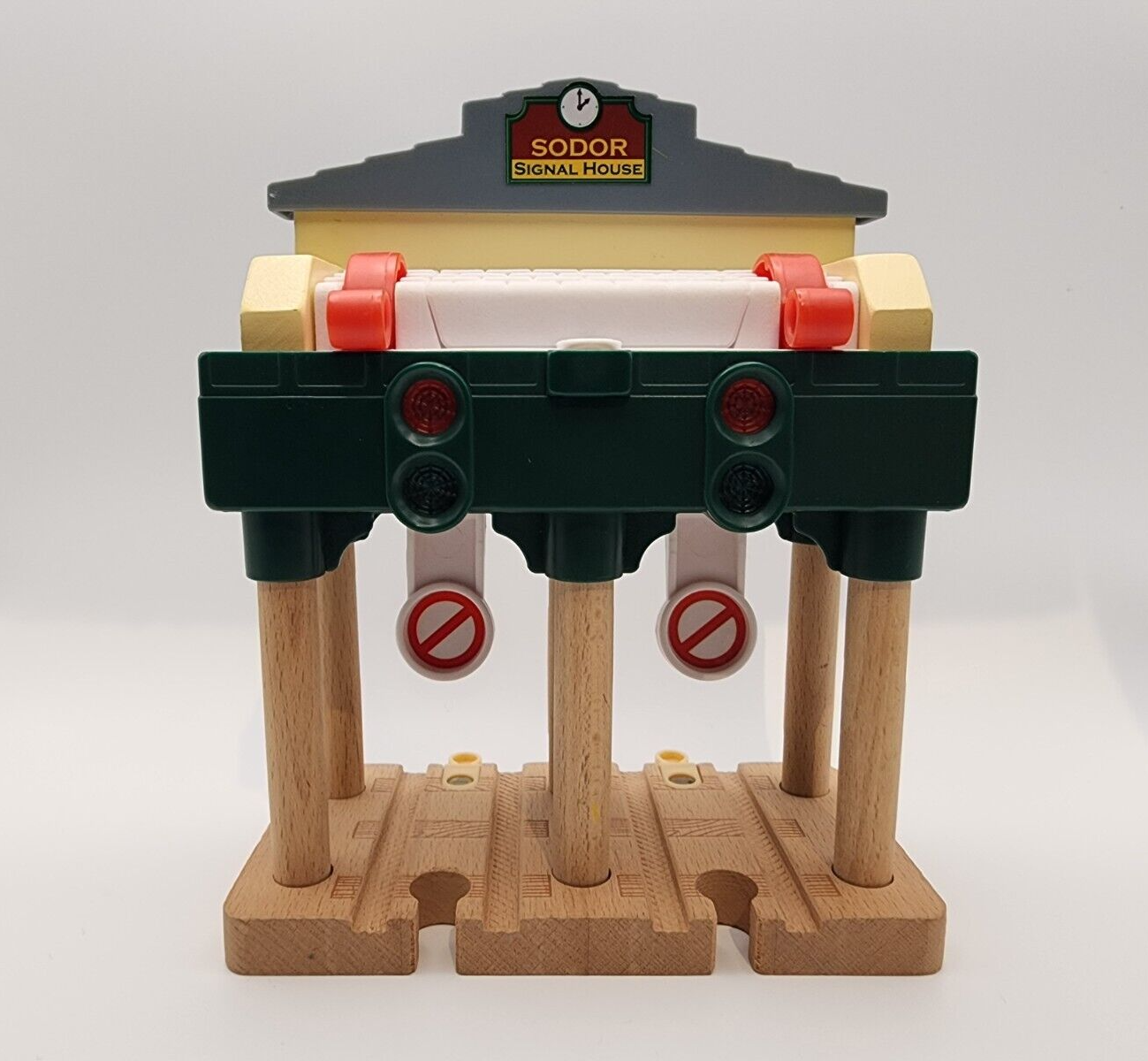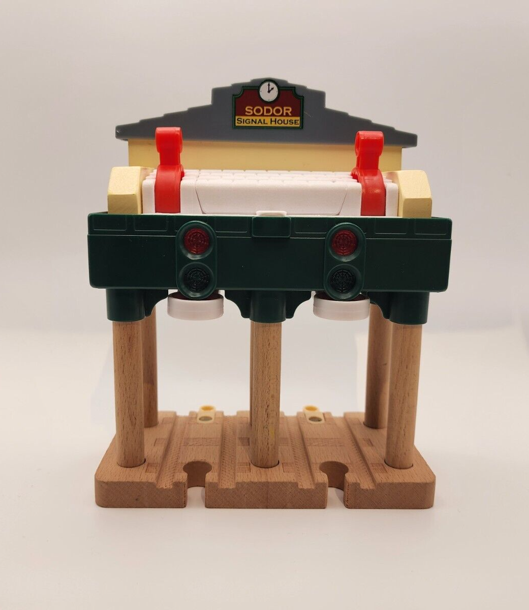 The Deluxe Over the Track Signal is a track accessory for Thomas & Friends Wooden Railway. Pushing the levers over each of the tracks segment raises or lowers the stop signs and causes red and green lights to flash and train sounds to be heard. This accessory is in excellent used condition. All lights and sounds operate and are powered by 2 AA batteries (included). Labeled Y4092 on the bottom with a 2012 copyright date Comes from a smoke free home