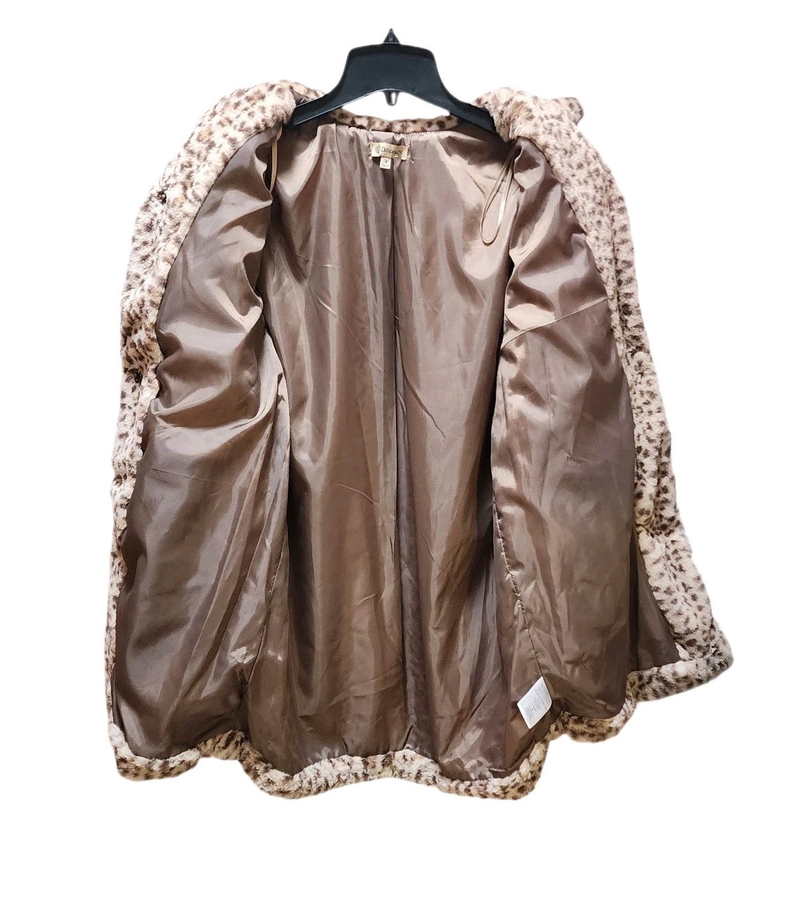 Democracy Women's Leopard prints Super Soft Faux Fur Coat Color Tan/Cream Size M Armpit 21.25" (×2) Length 32" Shoulder to shoulder 16" Arm length from shoulder seam 25" Hidden front snap button closure Color: Tan/Cream Allover Leopard print Collared Long sleeves Slant pockets at hips Lined Faux fur: 100% Polyester Lining: Polyester Machine wash.