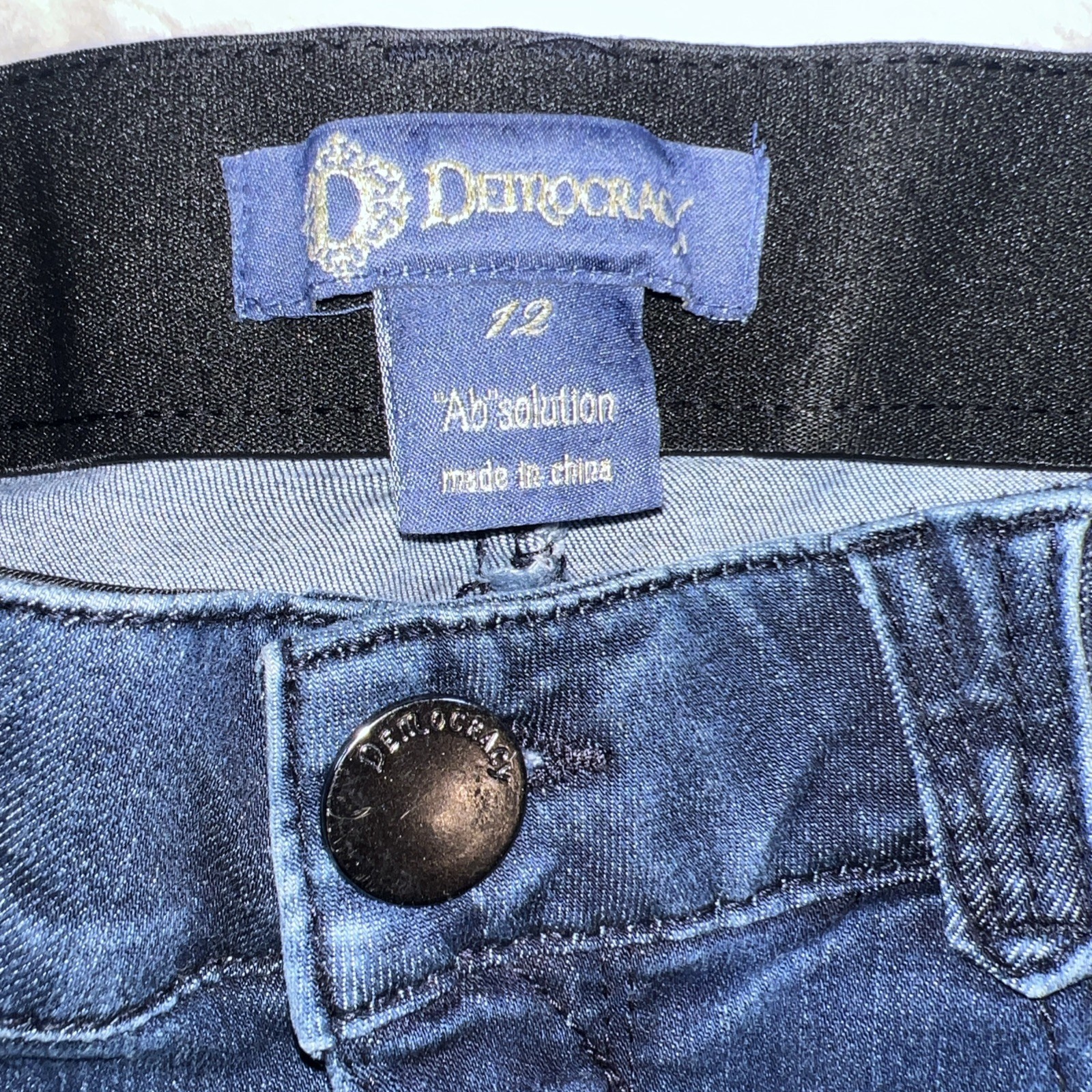 The Democracy Jeans for women in size 12 feature AB technology for a skinny and straight fit with added stretch for comfort. The distressed blue denim adds a trendy touch to the classic 5-pocket design, making them suitable for year-round wear. Made of a cotton blend fabric with a mid-rise waist, these jeans are machine washable for easy care. The zip closure and solid pattern add to the overall style, perfect for a casual and versatile wardrobe staple.
