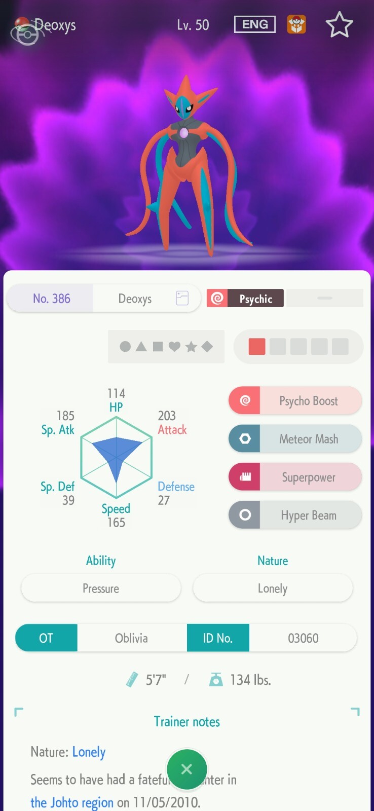 Free eBay listing template designed by dewiso.com FulaCity PokeCenter For all your Pokémon needs Details This Pokemon you'll receive has the following details: OT: Gamestp & Oblivia ID: 06218 & 03060 Event: GameStop Deoxys & International Oblivia Deoxys This trade is for game: Pokemon Home through Moving Key NOT Home Trade This event is 100% legal and untouched. For further details on this event you can use Bulbapedia. If you want to see my other events [click here] . If you have further questions [click here] to contact me. You can also reach me via : fulacitypokecenter Handling information To trade: * After purchasing you can go ahead and message me your IGN (in-game-name), your timezone and available times * You need Home Premium * This will be traded via Moving Key NOT Home Trade No shipping involved at all since this is a virtual trade. Why buy from me? Over 3000+ positive feedback with over 10.000+ sales. Fast delivery 100% legal Pokemon (!!!) safe to use anywhere. Use them in Pokemon Home, GTS, Pokemon Online Battles, Online Raids, Online Trades without issues! Disclaimer: I'm not affiliated with Nintendo, Creatures Inc, The Pokémon Company or GAMEFREAK. You are paying for the time and effort I spent breeding/obtaining the listed Pokémon.