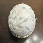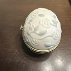 This Department 56 Snowbabies trinket box is a unique addition to any collection. The oval-shaped egg features a white porcelain finish with a matte texture and is signed by the artist. The box is medium-sized, measuring 3 inches in length and 2 inches in width. The egg is part of the 1986 collection and is an original piece. It comes boxed and is perfect for adults who appreciate collectibles. The Snowbabies theme is baby and the occasion is Easter. The box is a great addition to any holiday or seasonal display.
