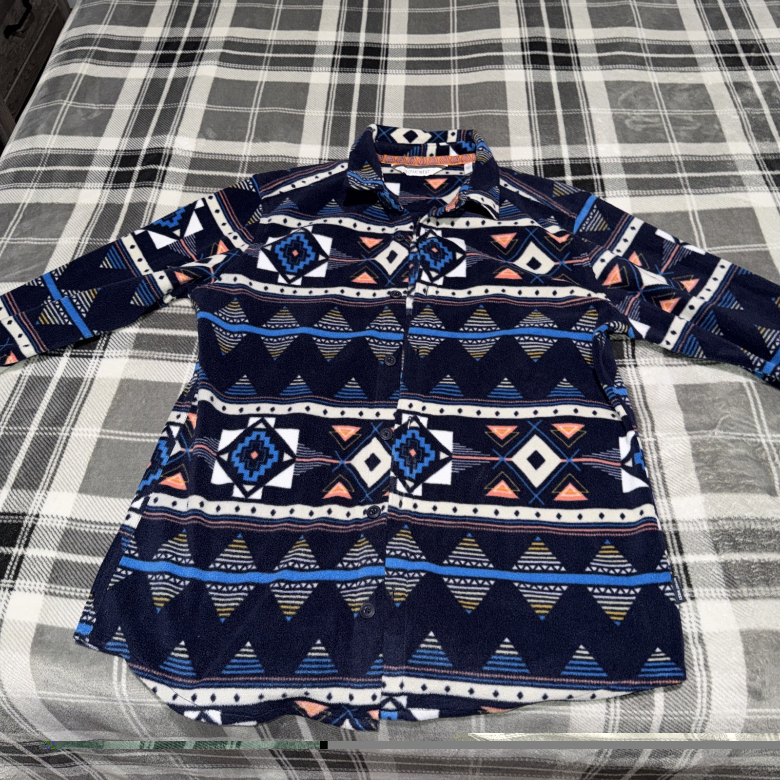 The Departwest Men's Medium Southwestern Polar Fleece Shirt in Aztec Pattern is a stylish and comfortable button-up shirt perfect for casual occasions. Made of soft polyester fleece, this multicolor shirt features a collared neckline and long sleeves, ideal for the cold winter, fall, and spring seasons. The Aztec theme adds a unique touch to this regular fit shirt, making it a standout piece in any man's wardrobe. Easy to care for with machine washable instructions, this shirt from the brand Buckle is a versatile and fashionable choice for everyday wear.