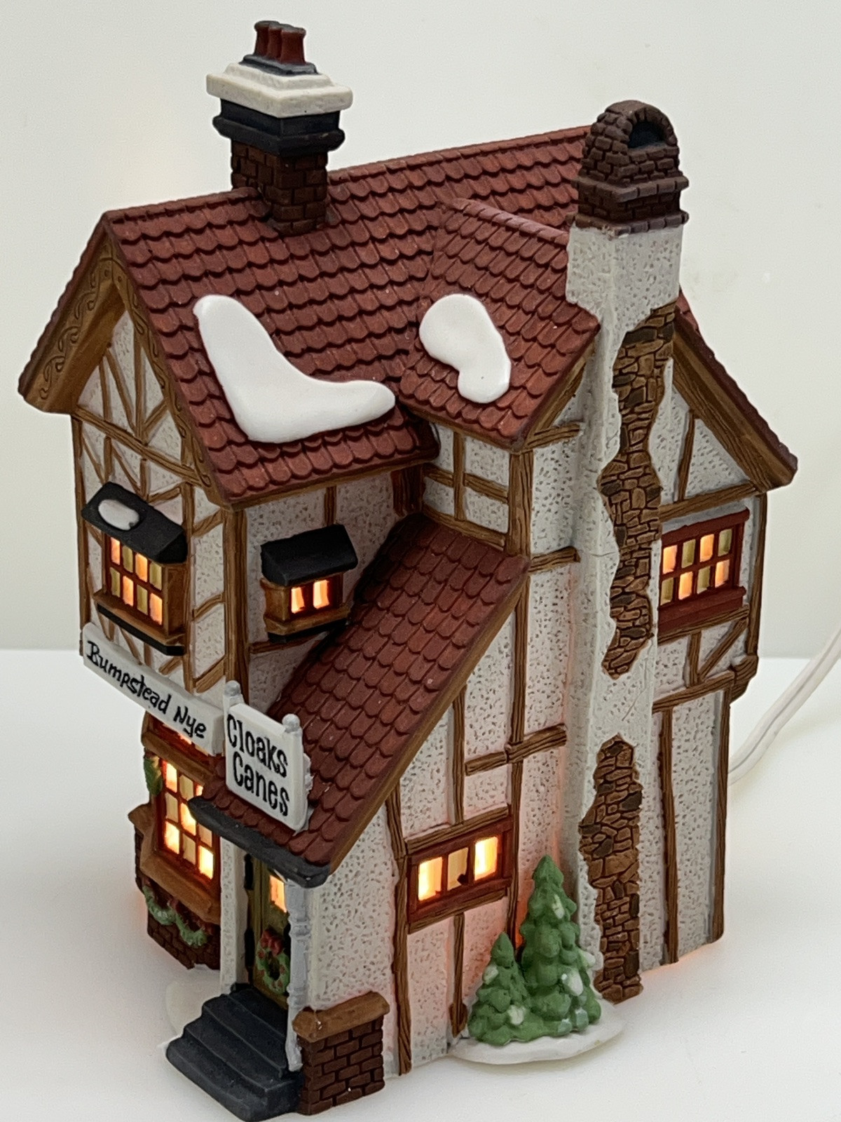 Dept 56 "Bumpstead Nye Cloaks And Canes" from the Dickens Village Collection is a medium-sized, hand-painted porcelain house with an asymmetrical shape. It features Victorian style, illuminated design, and is suitable for a seasonal village display. The multicolor house, part of the Heritage Village Collection, is from 1993 and measures 4-1/2" in length, 4-1/2" in width, and 8" in height. It comes boxed and is a retired piece. Pristine condition with all original packaging including cord & light