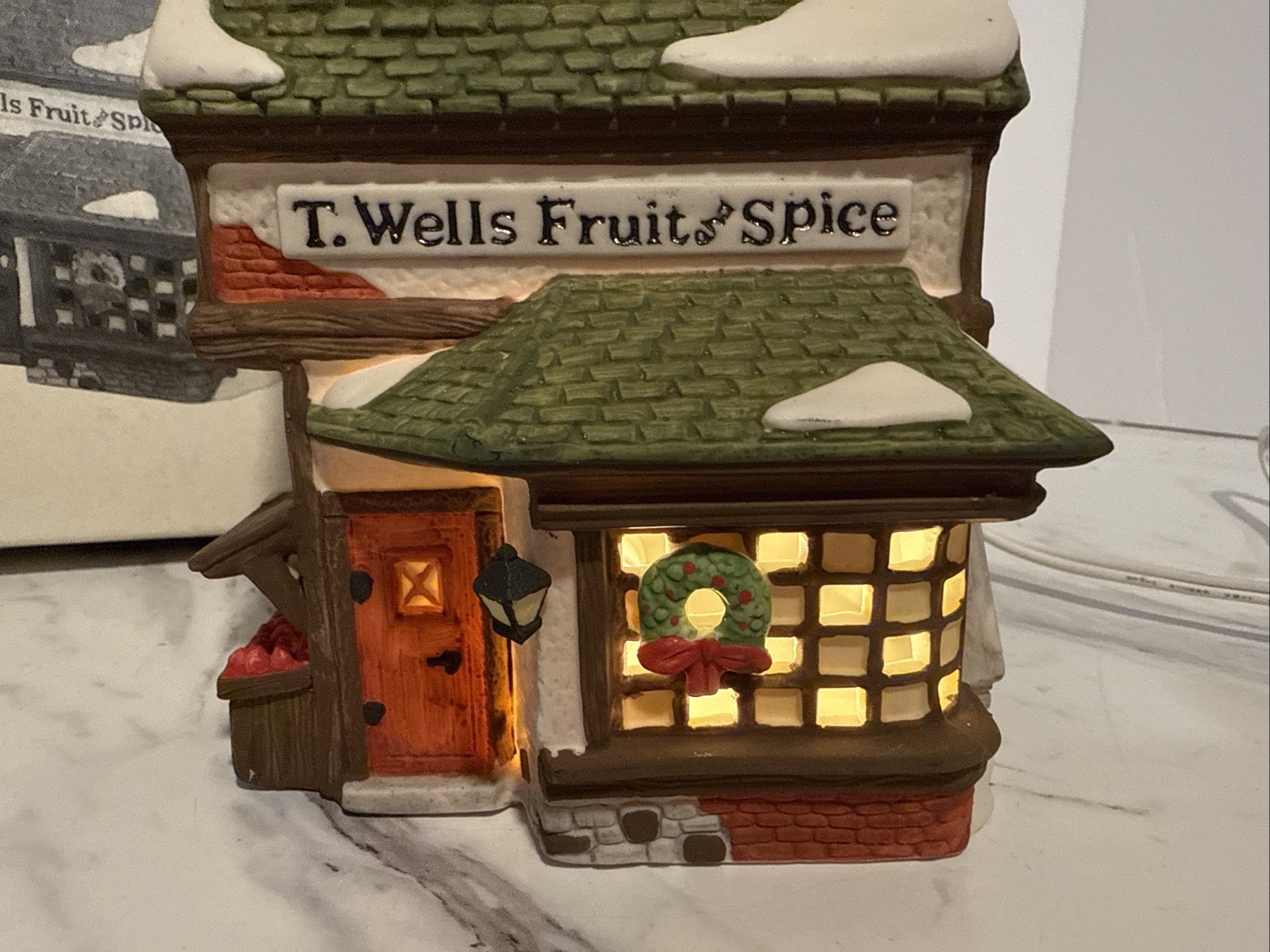 Dept 56 Dickens Village - T. Wells Fruit Spice Shop - Vintage 1988 5924-2 READ Pre-Owned in very good condition. Note: The cardboard sleeve for foam box is damaged. See all photos for best representation. Thank you for liking and supporting my small business!