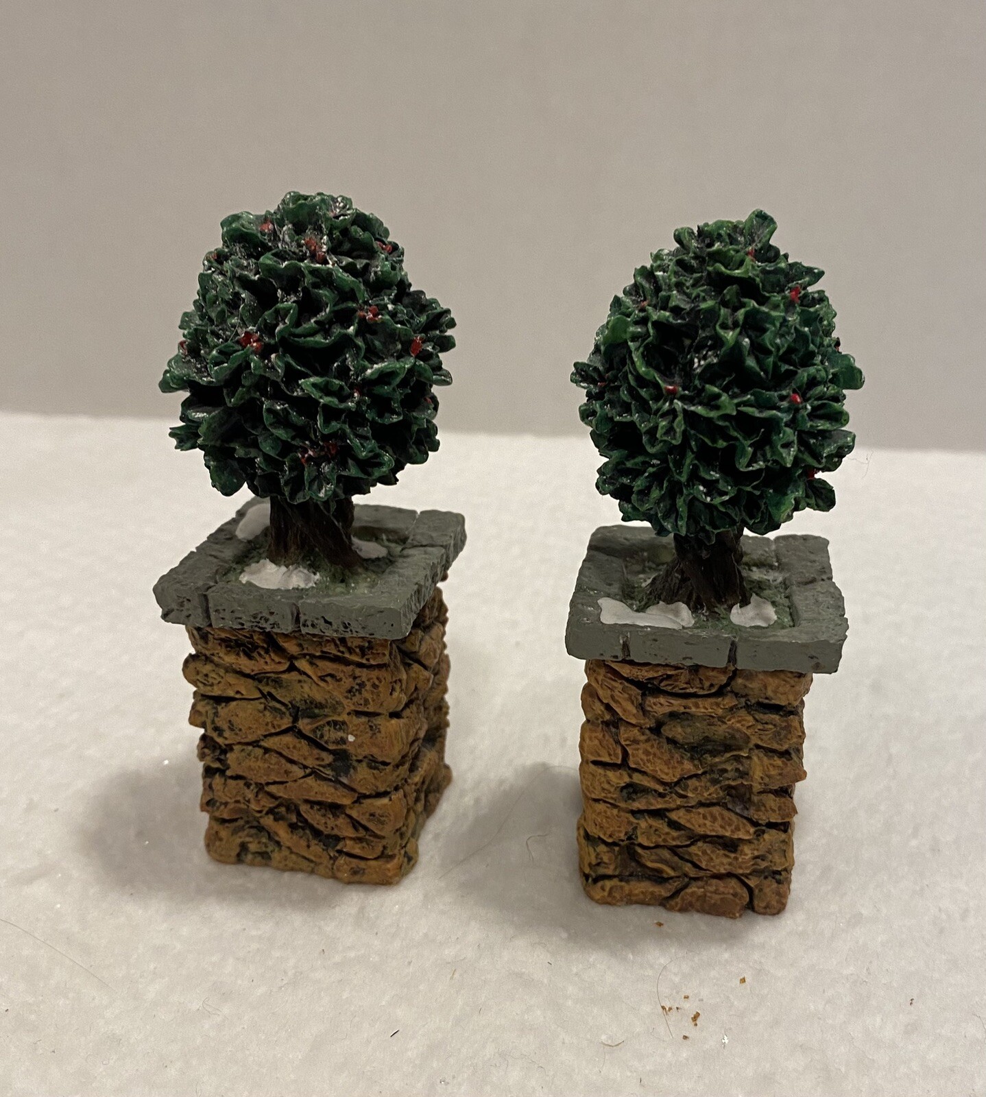 One tree trunk has been repaired, please see picture. Dept 56 Village Accessory STONE CORNER Posts with Holly Tree 52649 Retired. Includes box. Bin C