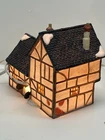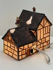 This beautiful porcelain cottage from the Department 56 Heritage Village Collection is a must-have for any collector of Christmas village houses. The Tudor Cottage, also known as the Dickens Village, features intricate hand-painted details and is illuminated for a cozy and charming display. The cottage is medium-sized, measuring 6 inches in length, 6 inches in height, and 4 inches in width, and is suitable for any room in your home. The cottage is a retired piece from 1985 and comes in its original box with the slip sleeve and styrofoam container. It is perfect for seasonal village displays and would make a great addition to any Dickens Village collection. The cottage is multi-colored and depicts a whimsical scene from Charles Dickens' Victorian era. This collectible item is a great gift for any lover of Christmas and Dickensian culture. Perfect condition with all original packaging including light & cord
